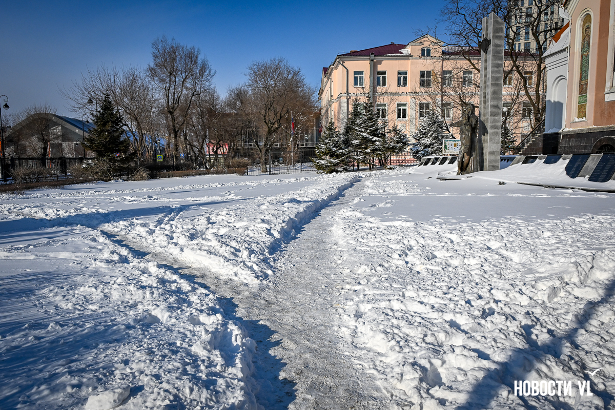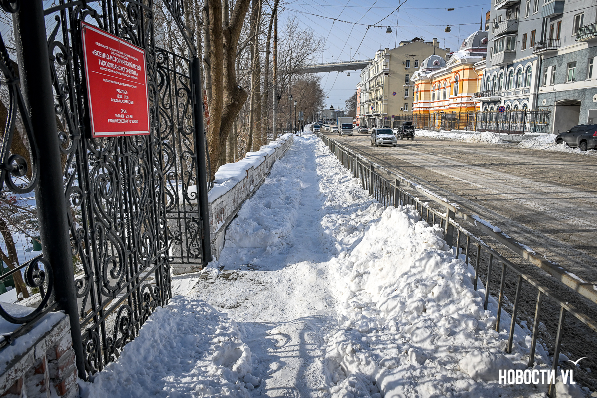 Удивительно, что в районе остановки «Цирк» возле зданий военных (Светланская, 72 и 74) снег не убран, а возле театра ТОФ и бывшего дома Семёнова (Светланская, 46), которые тоже относятся к военному ведомству, – чистый тротуар. Видимо, кто-то чуть более ответственно относится к подведомственной территории, чем другие.