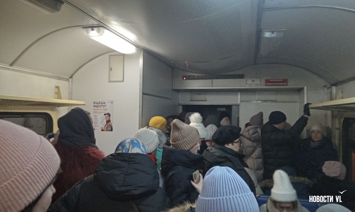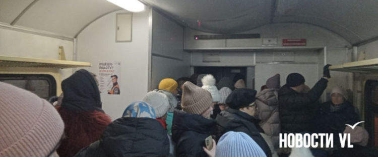 Обновление 16:24: Как сообщили в Экспресс Приморья, коллапс произошёл в одной электричке «Владивосток -- Мыс Чуркин». В других поездах столпотворени не было.