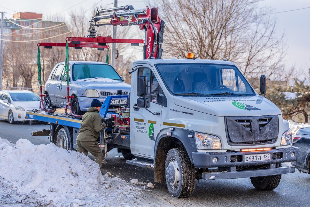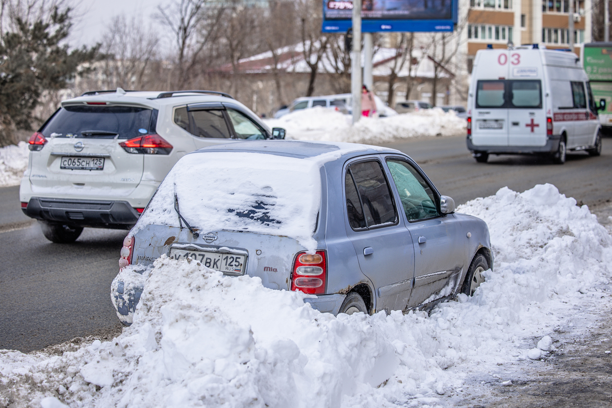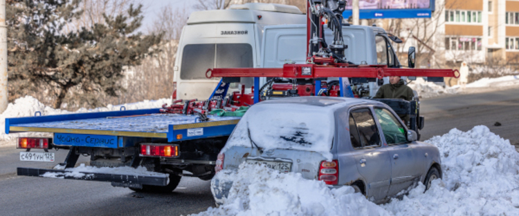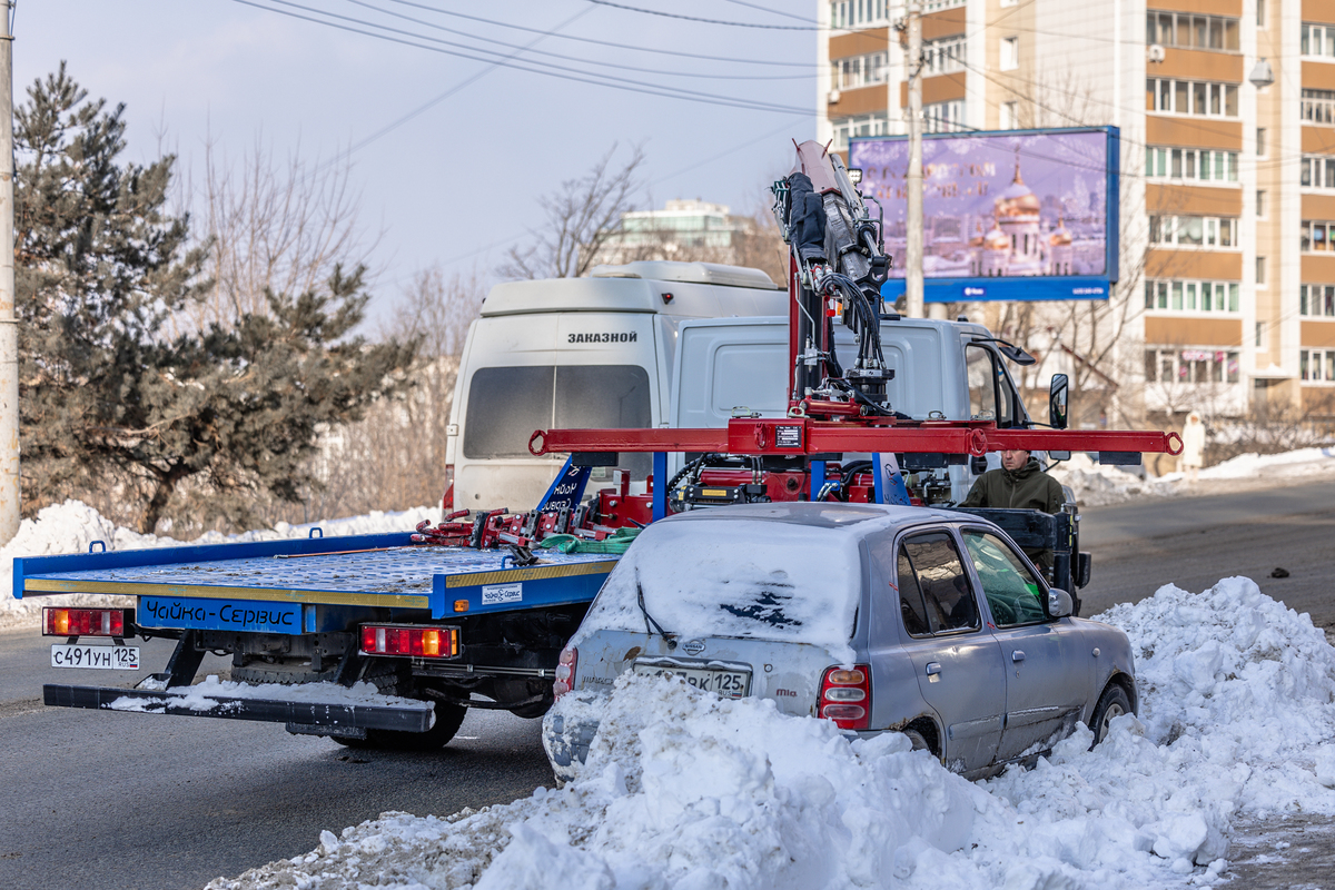 Во Владивостоке продолжается борьба со снегом, который выпал 10 января. Этой работе, кроме прочего, мешают припаркованные автомобили. Один из таких эвакуировали с Партизанского проспекта, он несколько дней стоял в сугробе неподалёку от остановки «Инструментальный завод».