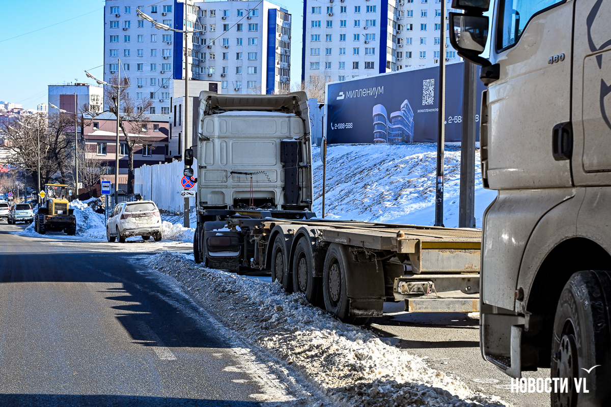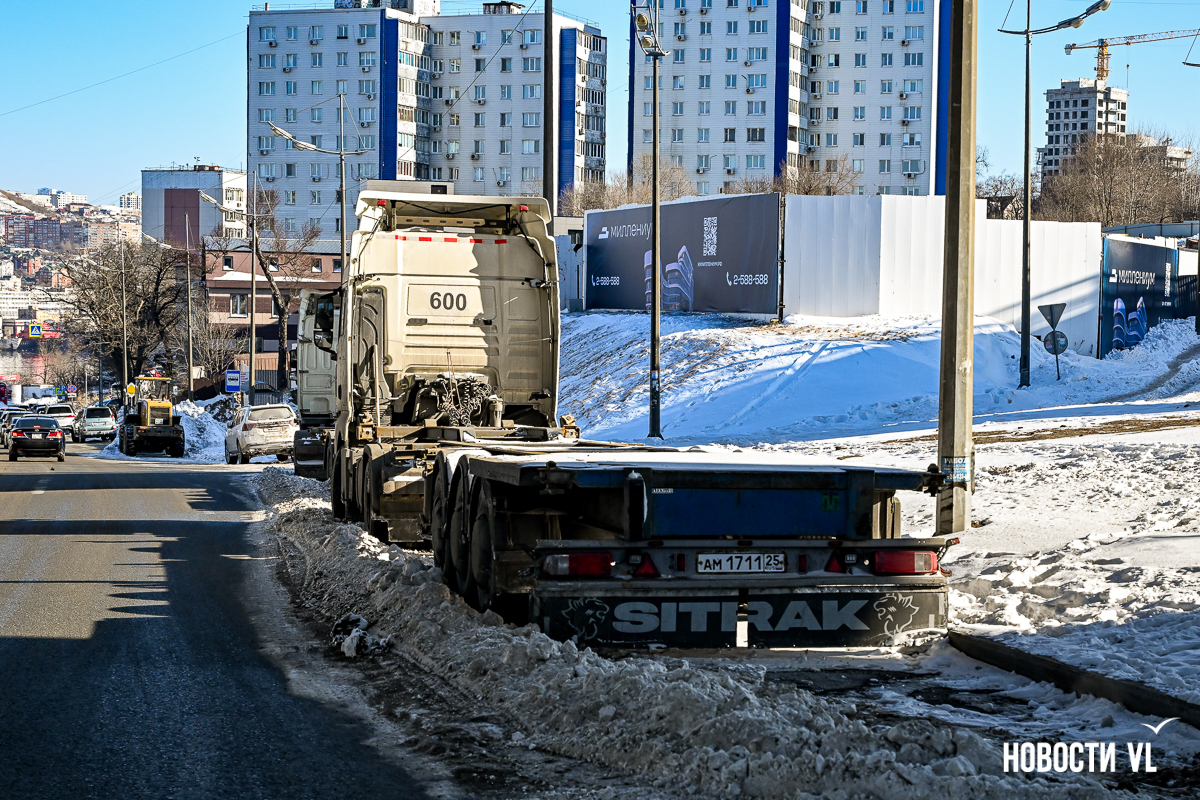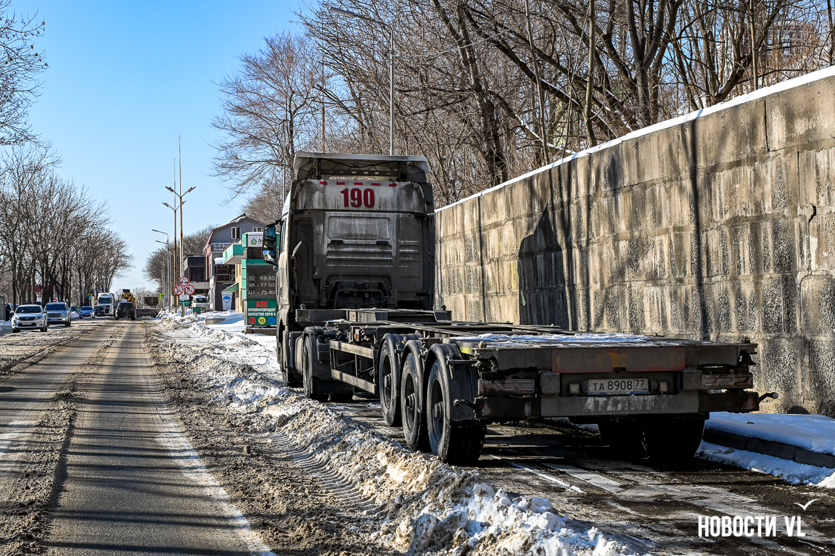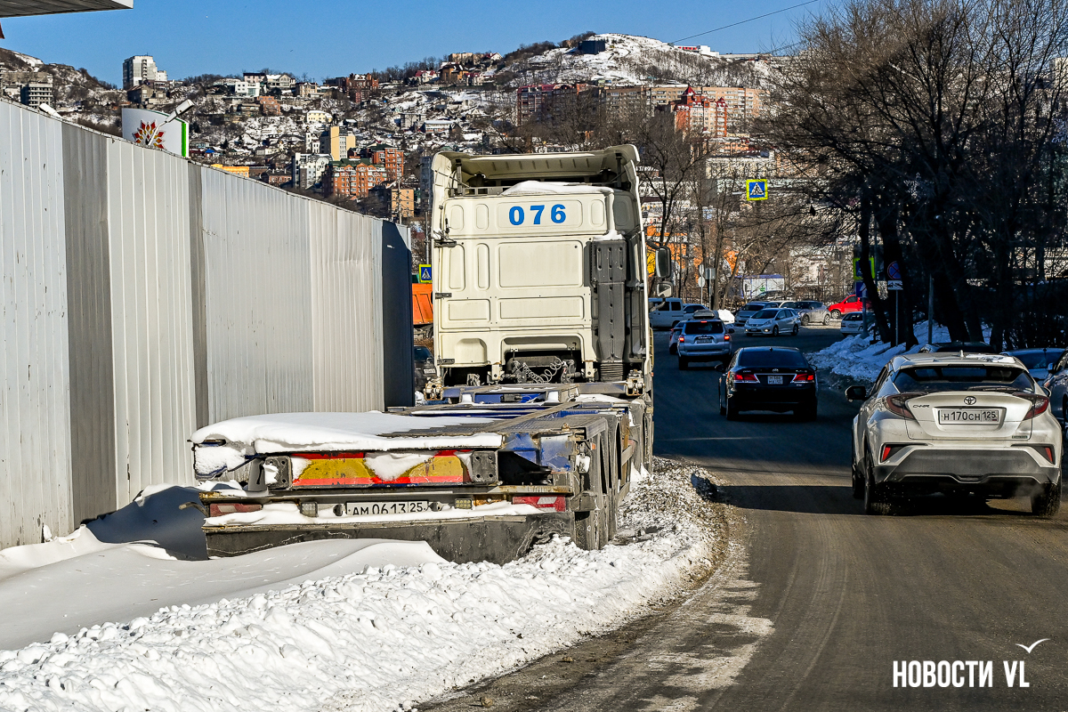 На Калинина в сугробах дремлют наполовину занесённые снегом фуры. Их поставили ответственные водители в момент, когда двигаться на большегрузе по городу стало невозможно, но до сих пор не убрали. Правда, особо и некуда – стоянки для такого транспорта во Владивостоке до сих пор нет, хотя её создание обсуждают уже десяток лет. Такой же «парад» выстроился и от Зари к Магнитогорской, но оттуда тяжёлые автомобили начали уже постепенно уезжать.