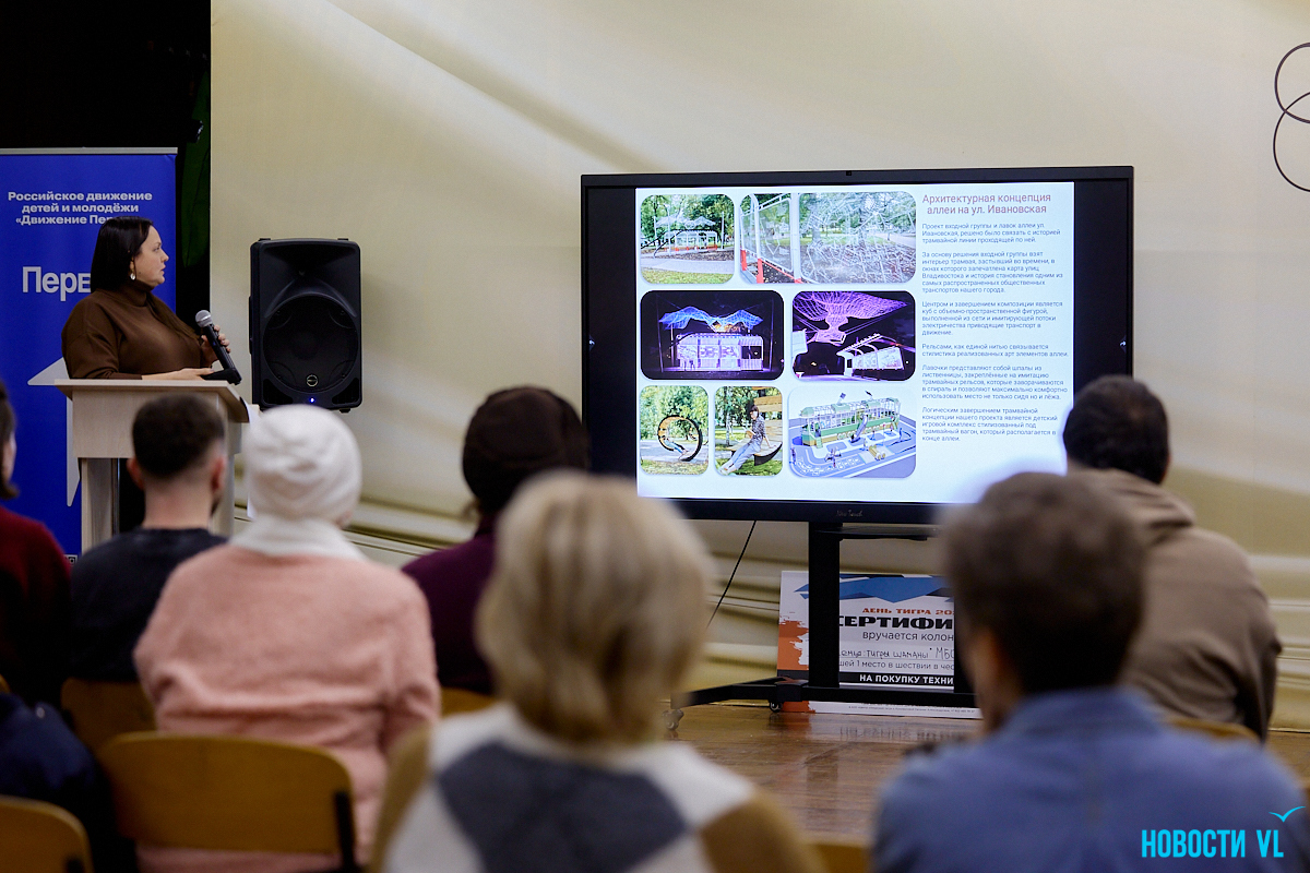 Входная группа – стилизованный трамвай со световой фигурой наверху. На «окнах» выгравирована сеть трамвайных путей Владивостока. Человек шагает сквозь этот вагон и дальше уже следует по аллее.