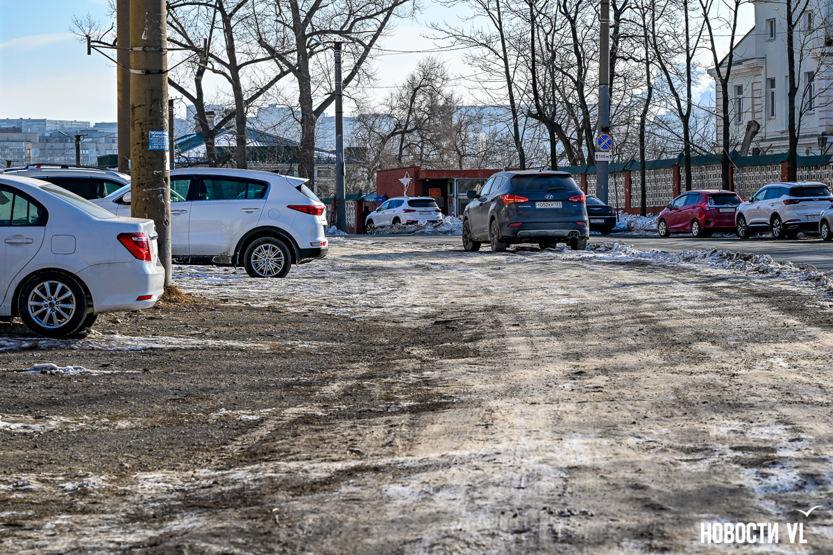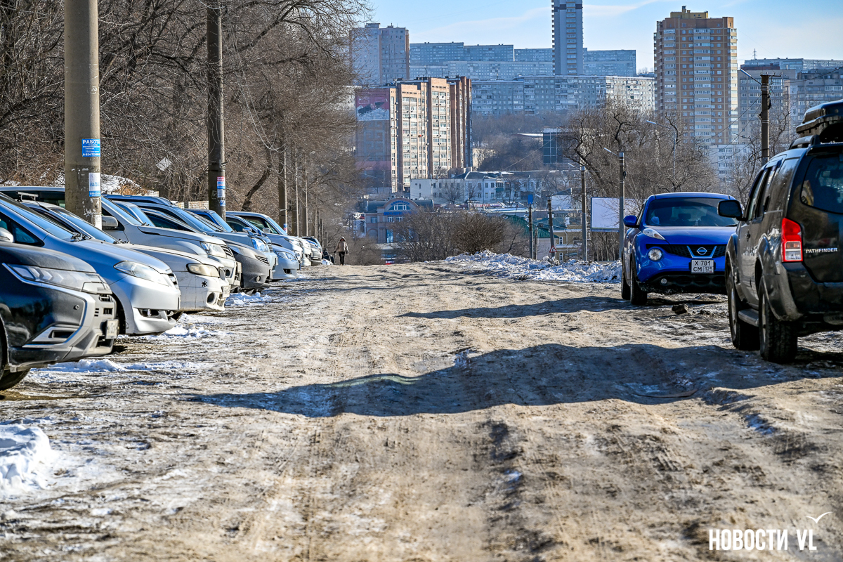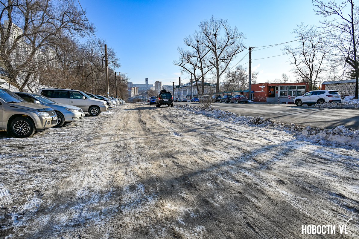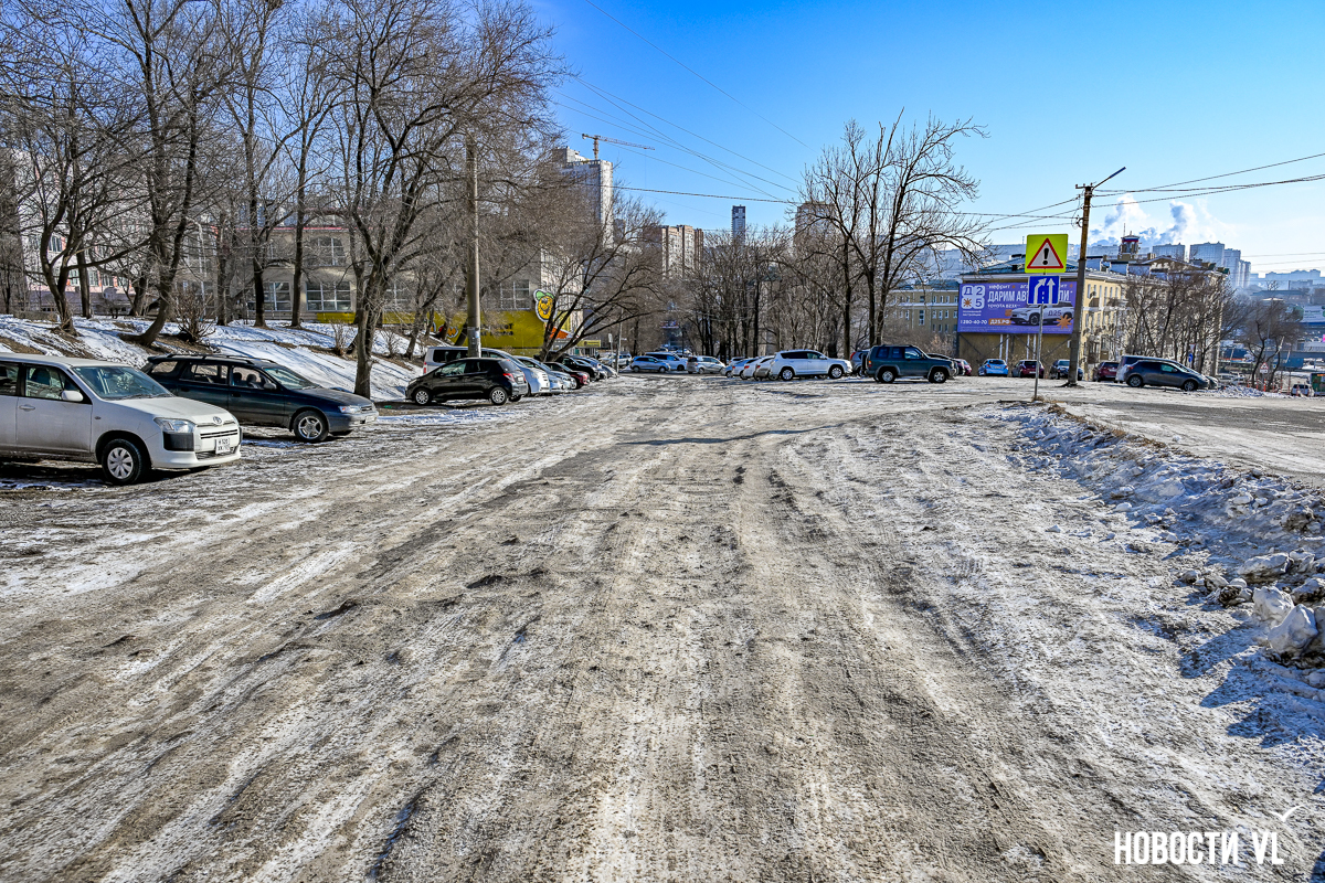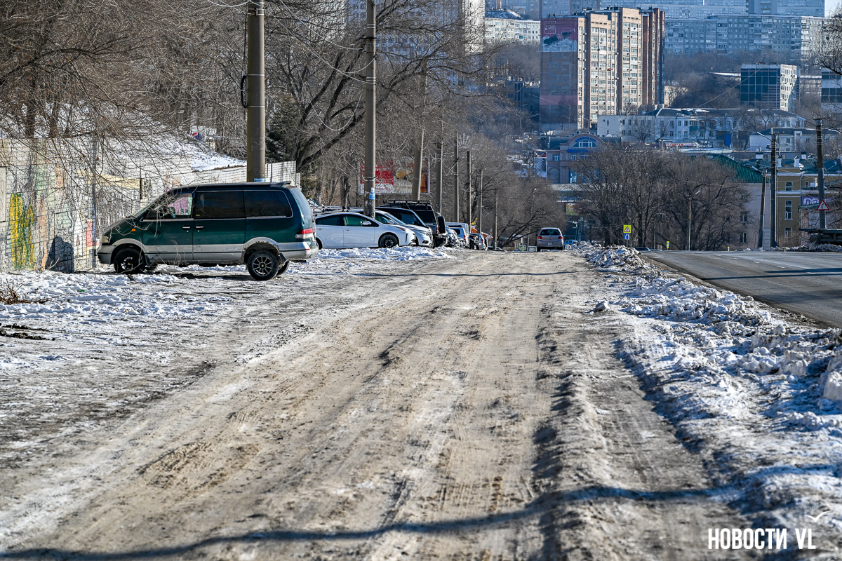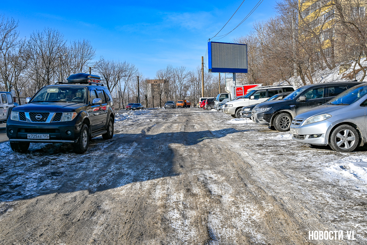 Трамвайные рельсы в этом месте, от Луговой до Гайдамака, сняли в 2012 году. С тех пор лысый земляной пятак под завязку занят автомобилями. Плюс посетители госпиталя ТОФ, он через дорогу. «Госпитальники», по словам местных жителей, выстраиваются и вдоль проезжей части - а трафик здесь жёсткий, весь день пробки.