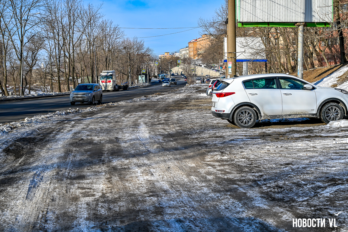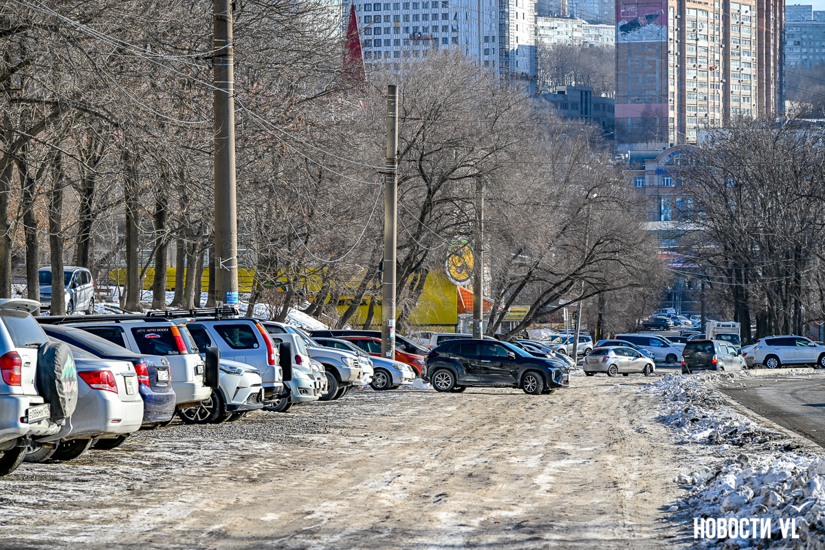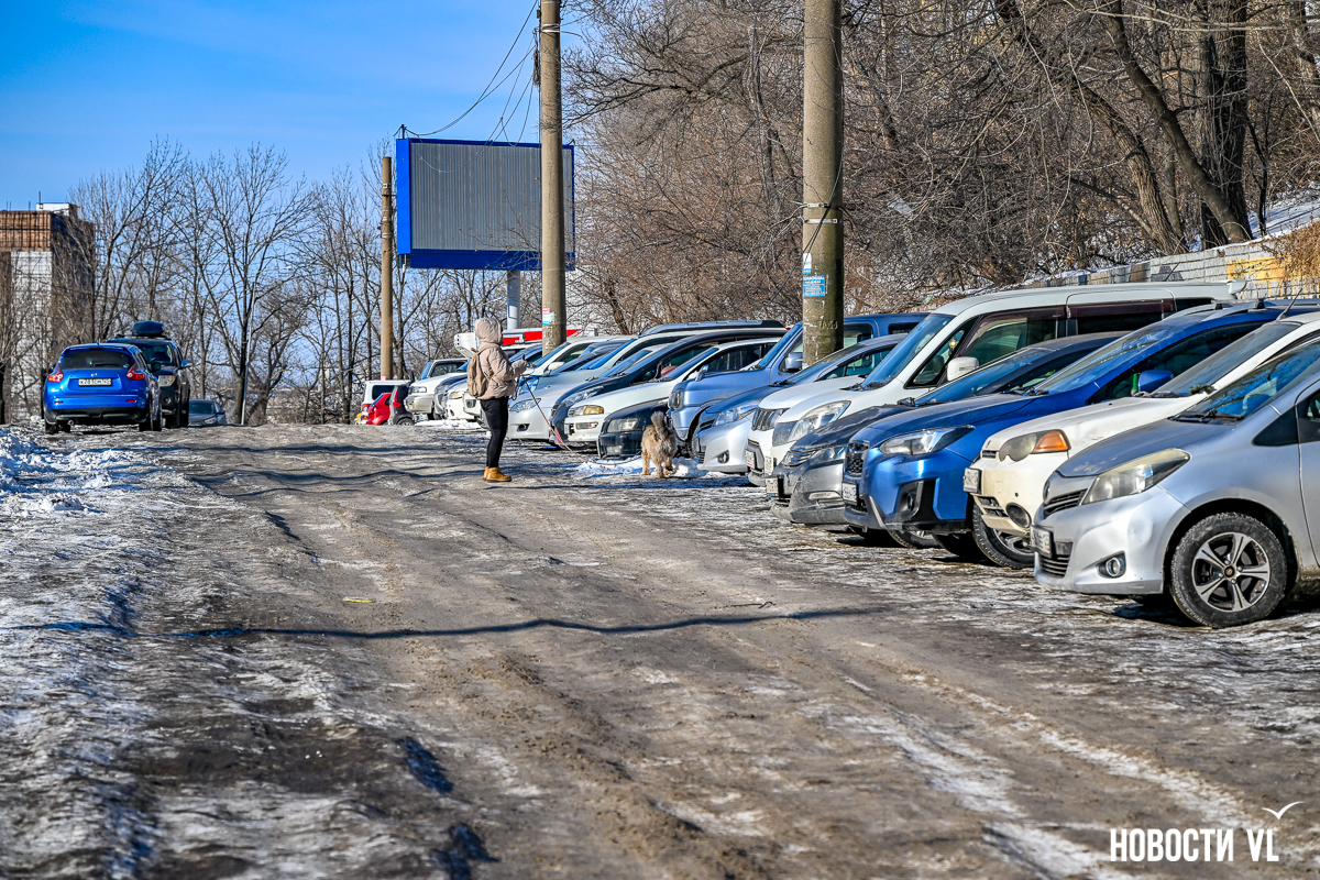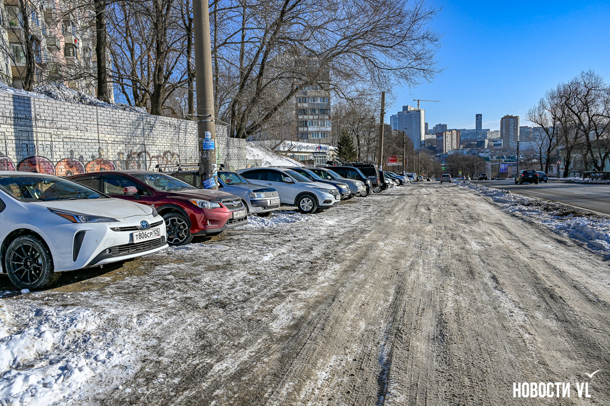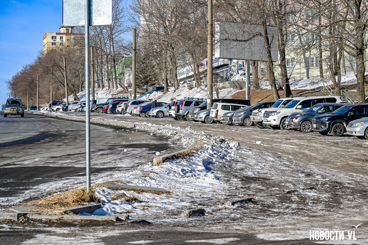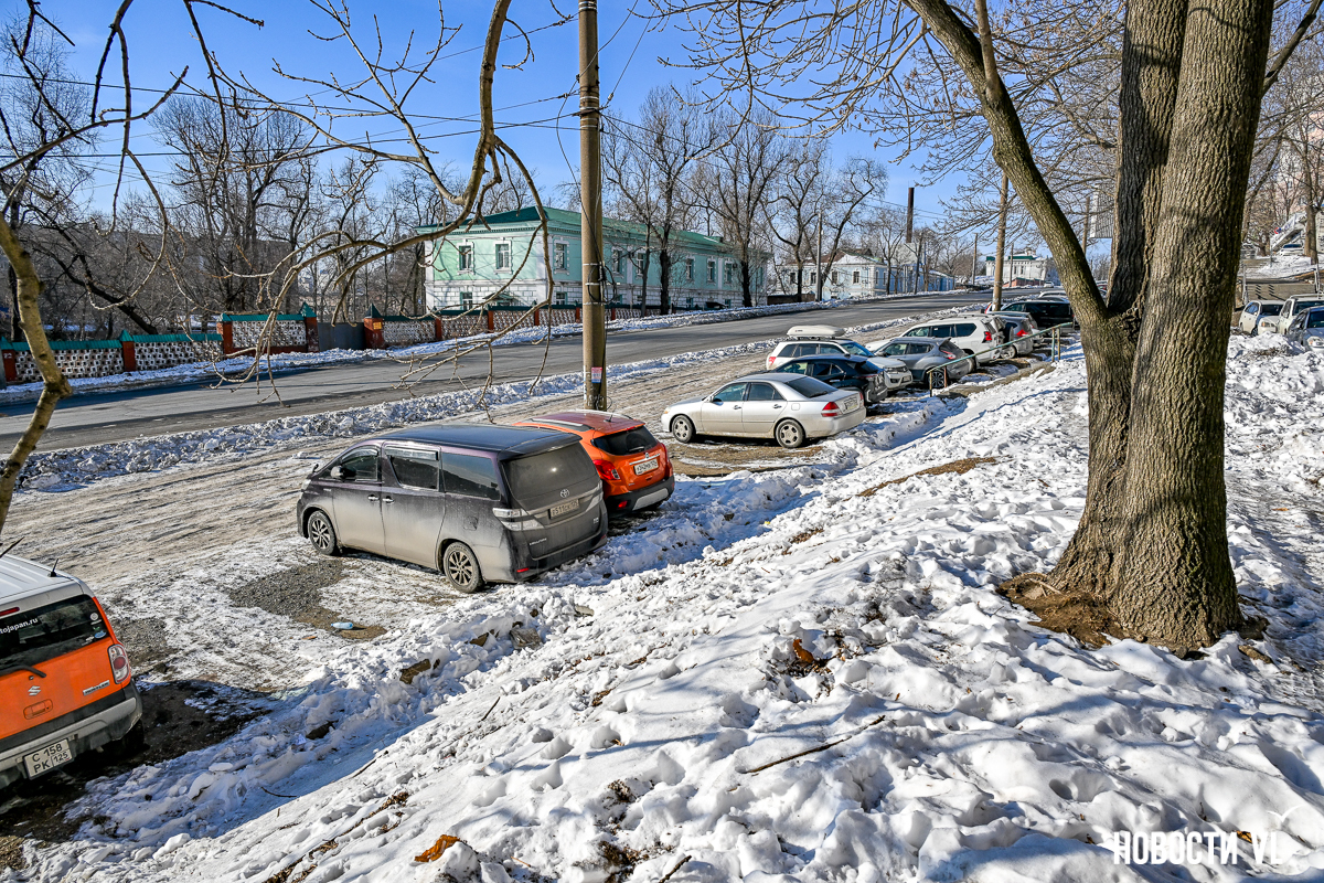 Трамвайные рельсы в этом месте, от Луговой до Гайдамака, сняли в 2012 году. С тех пор лысый земляной пятак под завязку занят автомобилями. Плюс посетители госпиталя ТОФ, он через дорогу. «Госпитальники», по словам местных жителей, выстраиваются и вдоль проезжей части - а трафик здесь жёсткий, весь день пробки.
