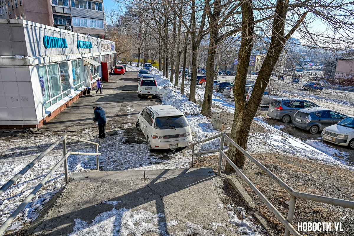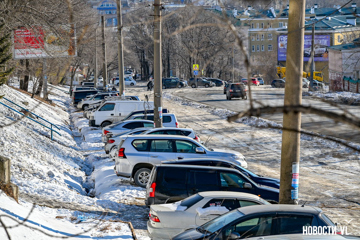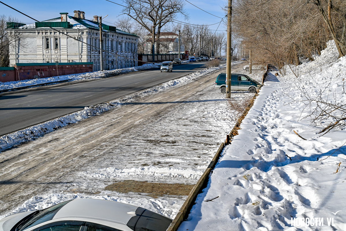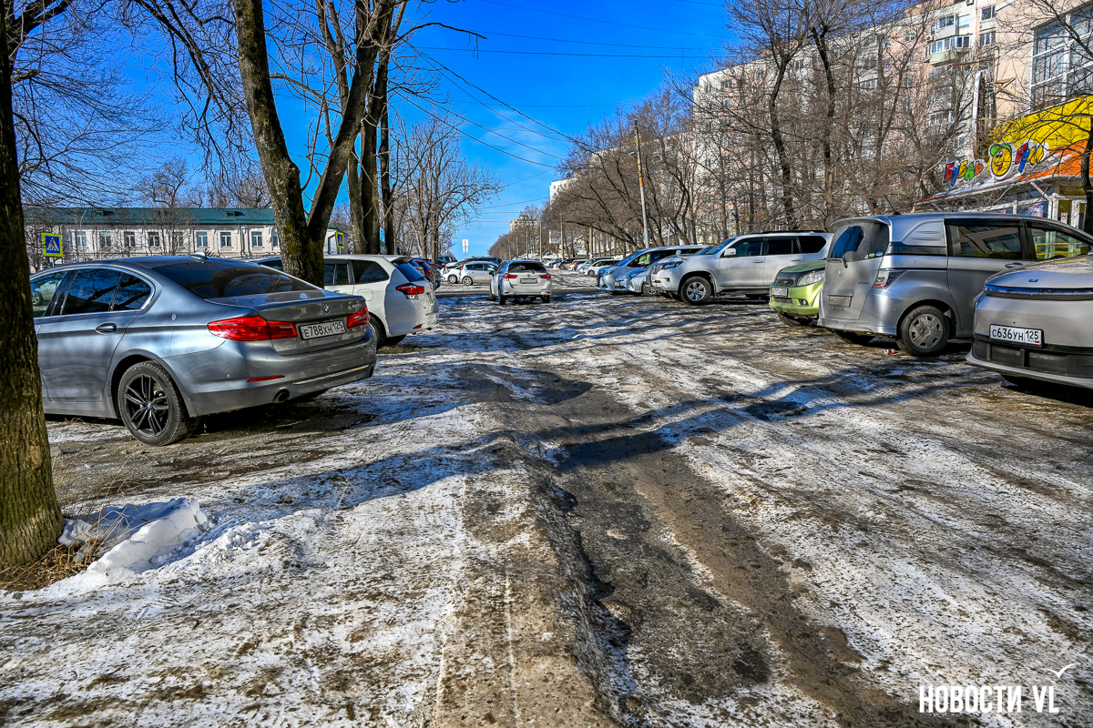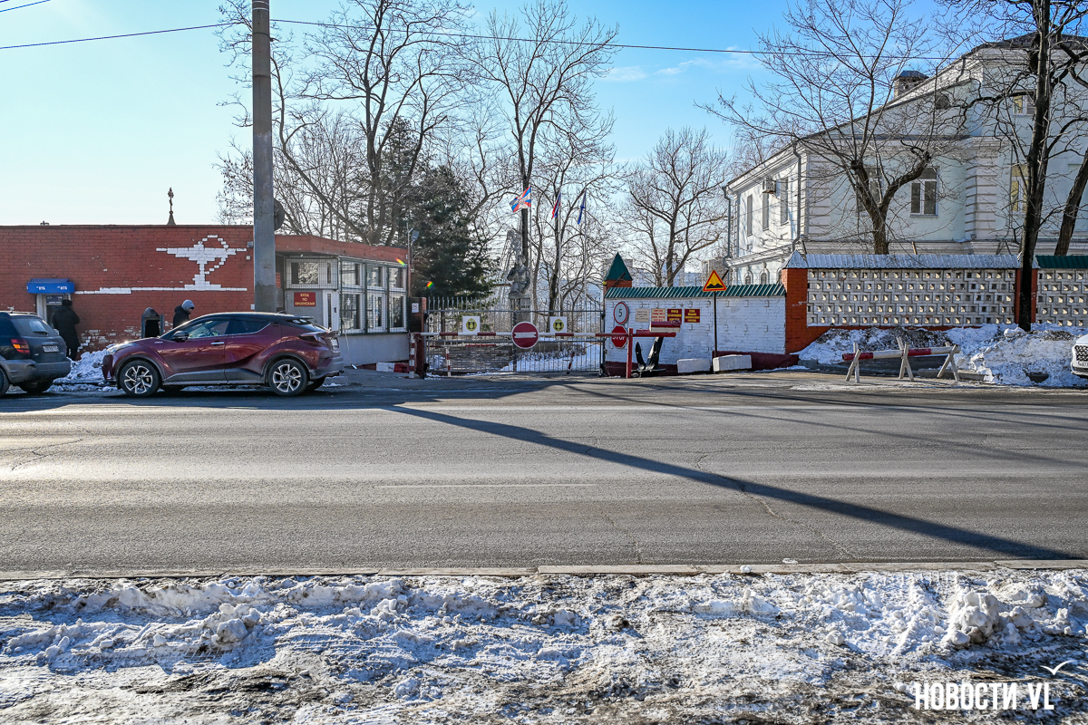 Трамвайные рельсы в этом месте, от Луговой до Гайдамака, сняли в 2012 году. С тех пор лысый земляной пятак под завязку занят автомобилями. Плюс посетители госпиталя ТОФ, он через дорогу. «Госпитальники», по словам местных жителей, выстраиваются и вдоль проезжей части - а трафик здесь жёсткий, весь день пробки.