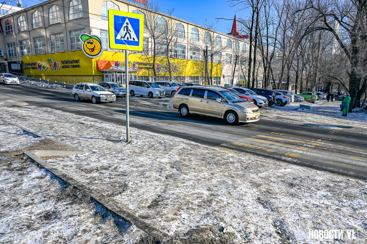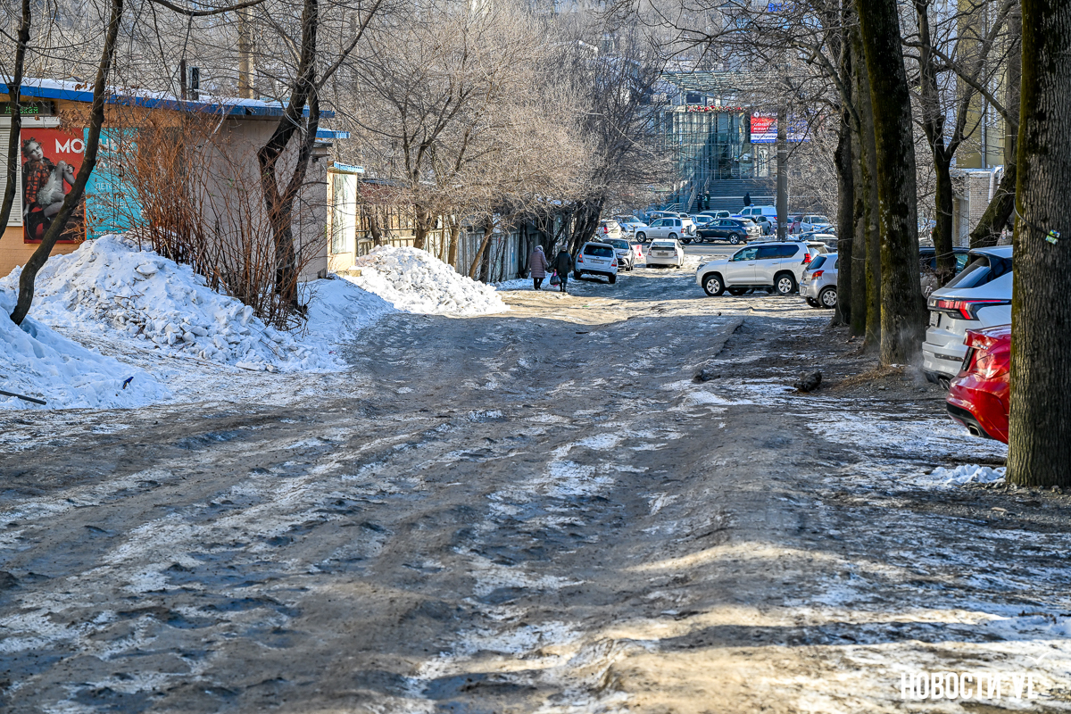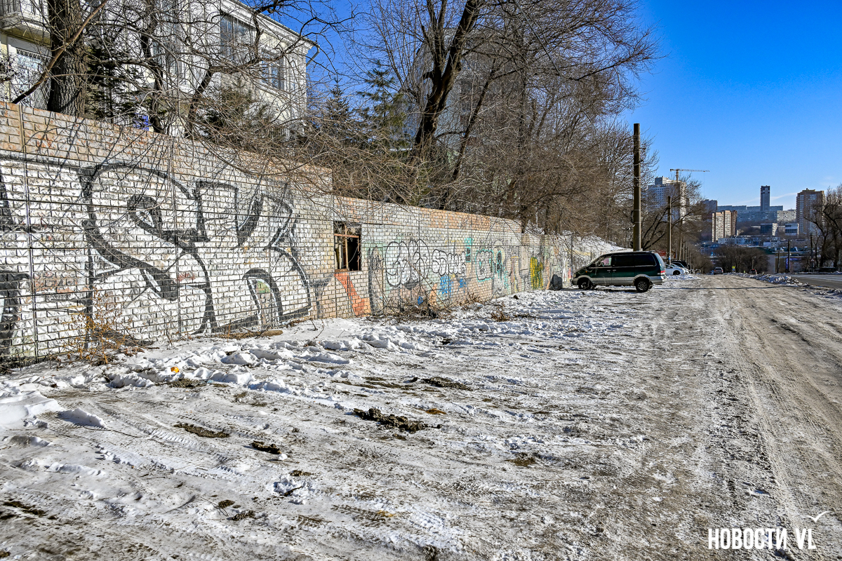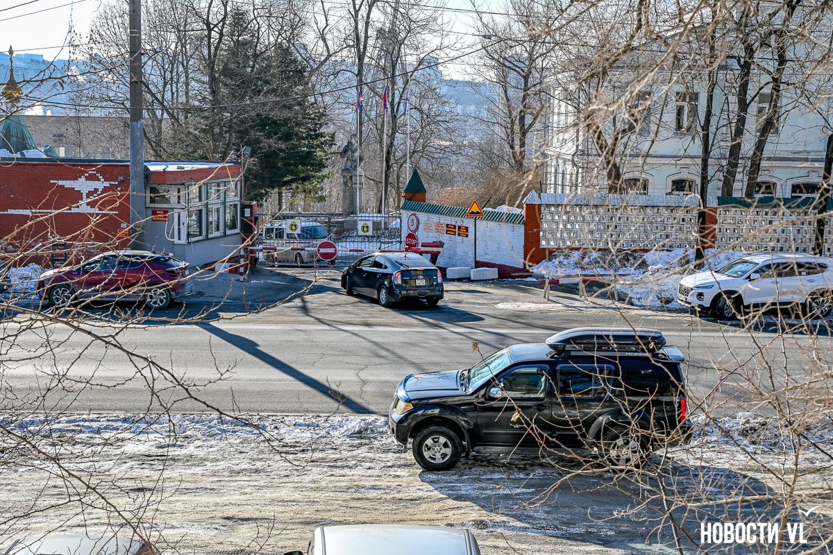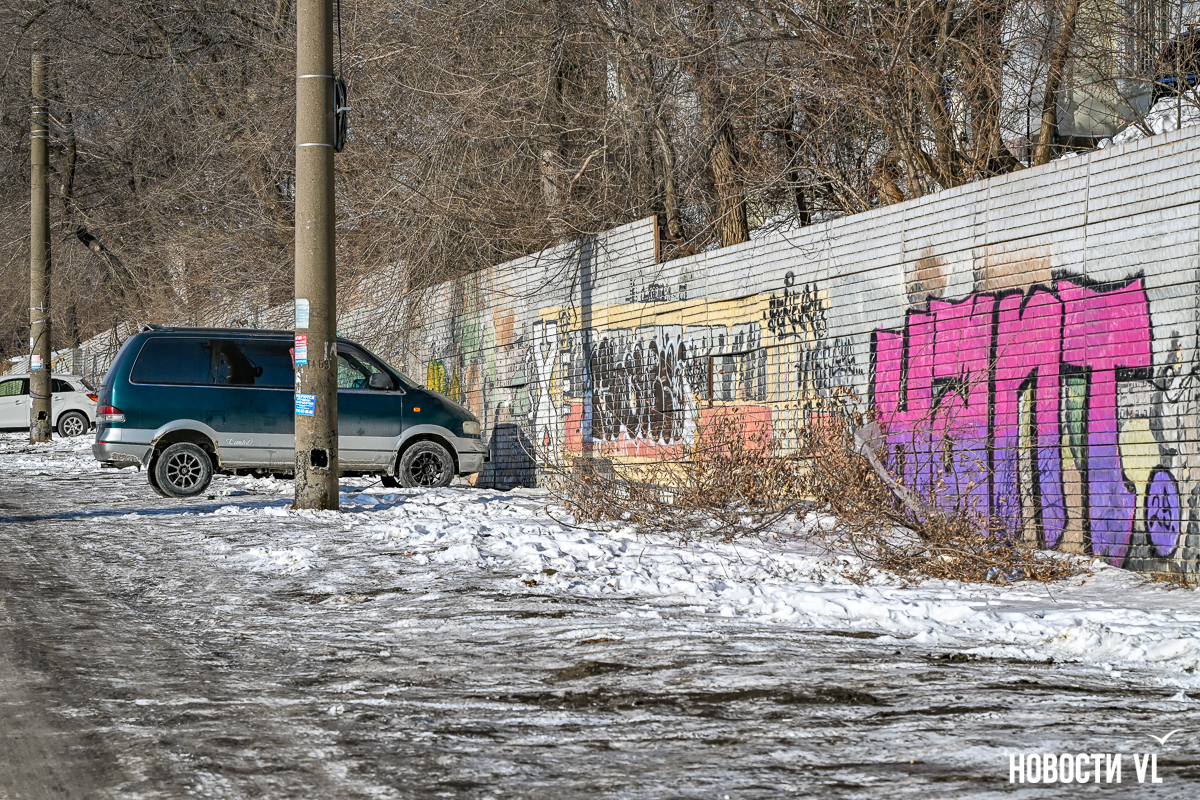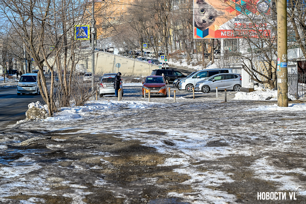 Трамвайные рельсы в этом месте, от Луговой до Гайдамака, сняли в 2012 году. С тех пор лысый земляной пятак под завязку занят автомобилями. Плюс посетители госпиталя ТОФ, он через дорогу. «Госпитальники», по словам местных жителей, выстраиваются и вдоль проезжей части - а трафик здесь жёсткий, весь день пробки.