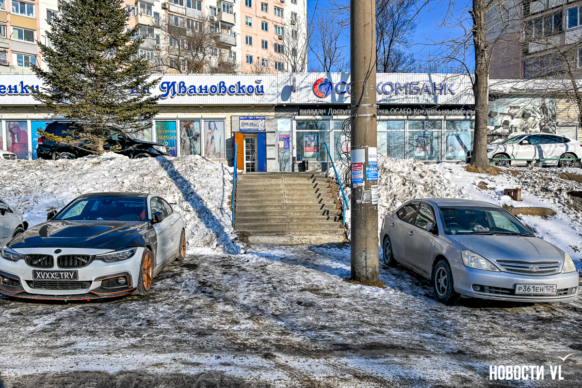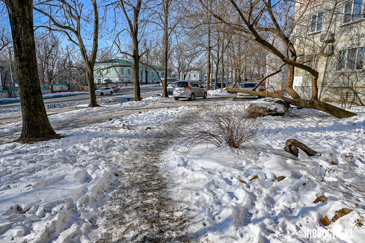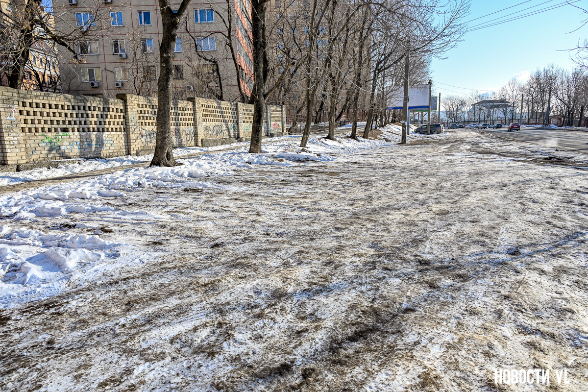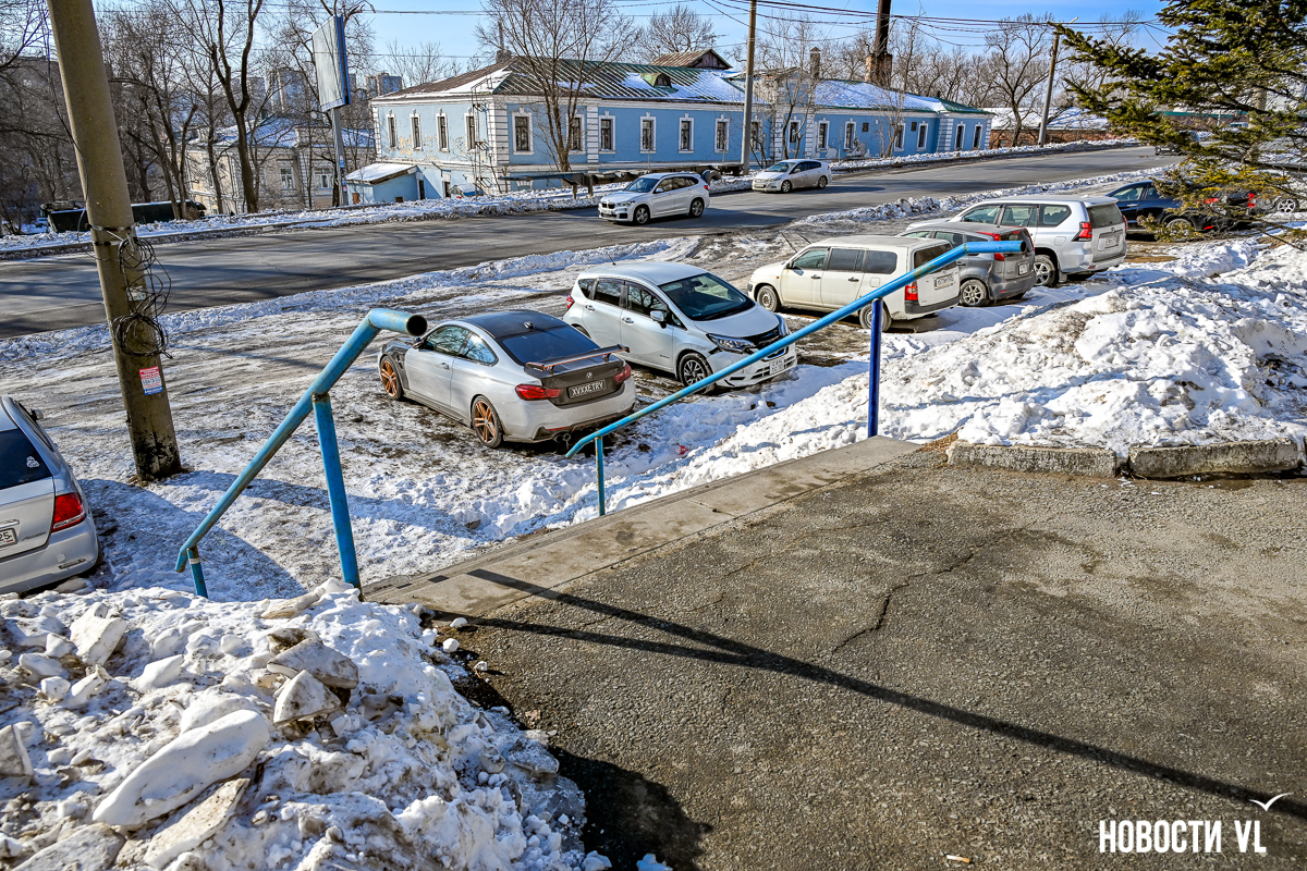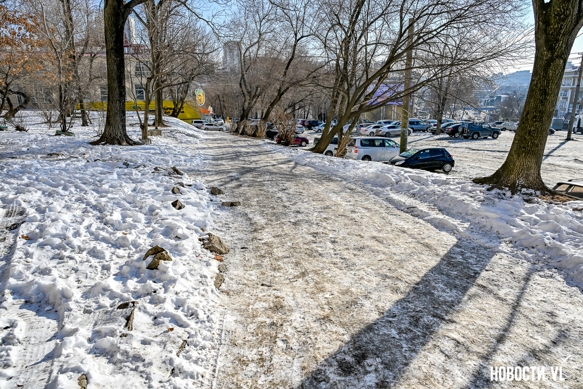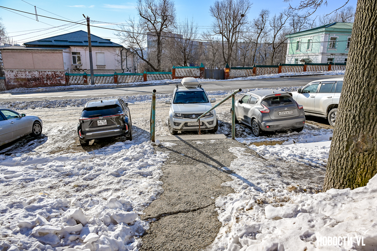 Трамвайные рельсы в этом месте, от Луговой до Гайдамака, сняли в 2012 году. С тех пор лысый земляной пятак под завязку занят автомобилями. Плюс посетители госпиталя ТОФ, он через дорогу. «Госпитальники», по словам местных жителей, выстраиваются и вдоль проезжей части - а трафик здесь жёсткий, весь день пробки.