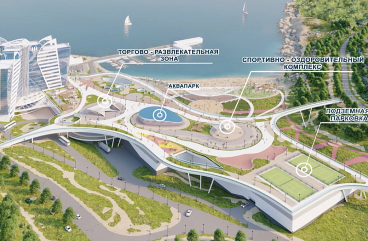 По документам, тут должны были возвести многофункциональный семейный центр «Аквапарадайз» – рекреационно-спортивный комплекс с аквапарком. Предполагалась четырёхзвёздочная гостиница на 303 номера высотой до 17 этажей, оздоровительный комплекс с 50-метровым спортивным бассейном и крытыми теннисными кортами, торгово-развлекательная зона, паркинг на 533 мест. Согласно паспорту объекта, строительство должны закончить в ноябре 2026 года. (Обновлено: В МЦУ Владивостока уточнили, что разрешение на строительство объекта продлили до 05.12.2027). Однако представители компании обещали аквапарк до конца 2025-го.