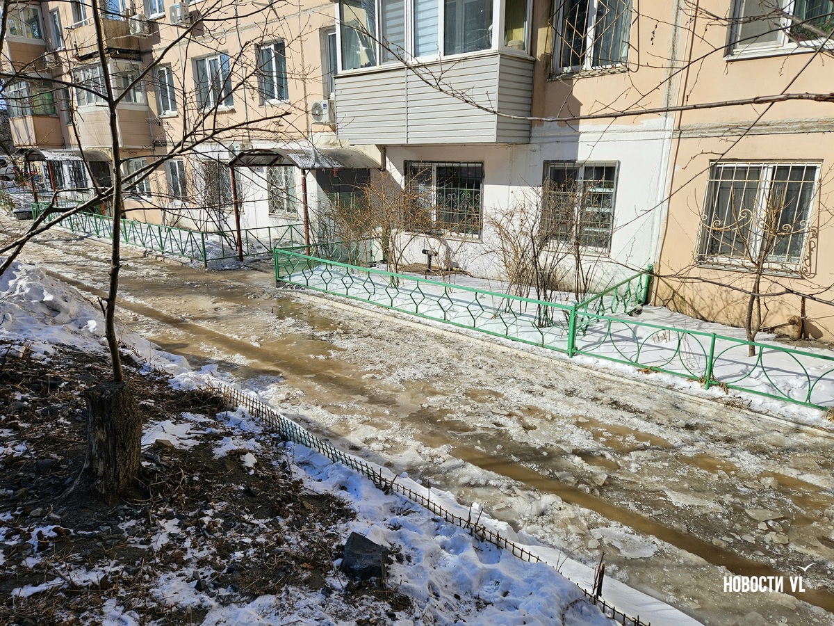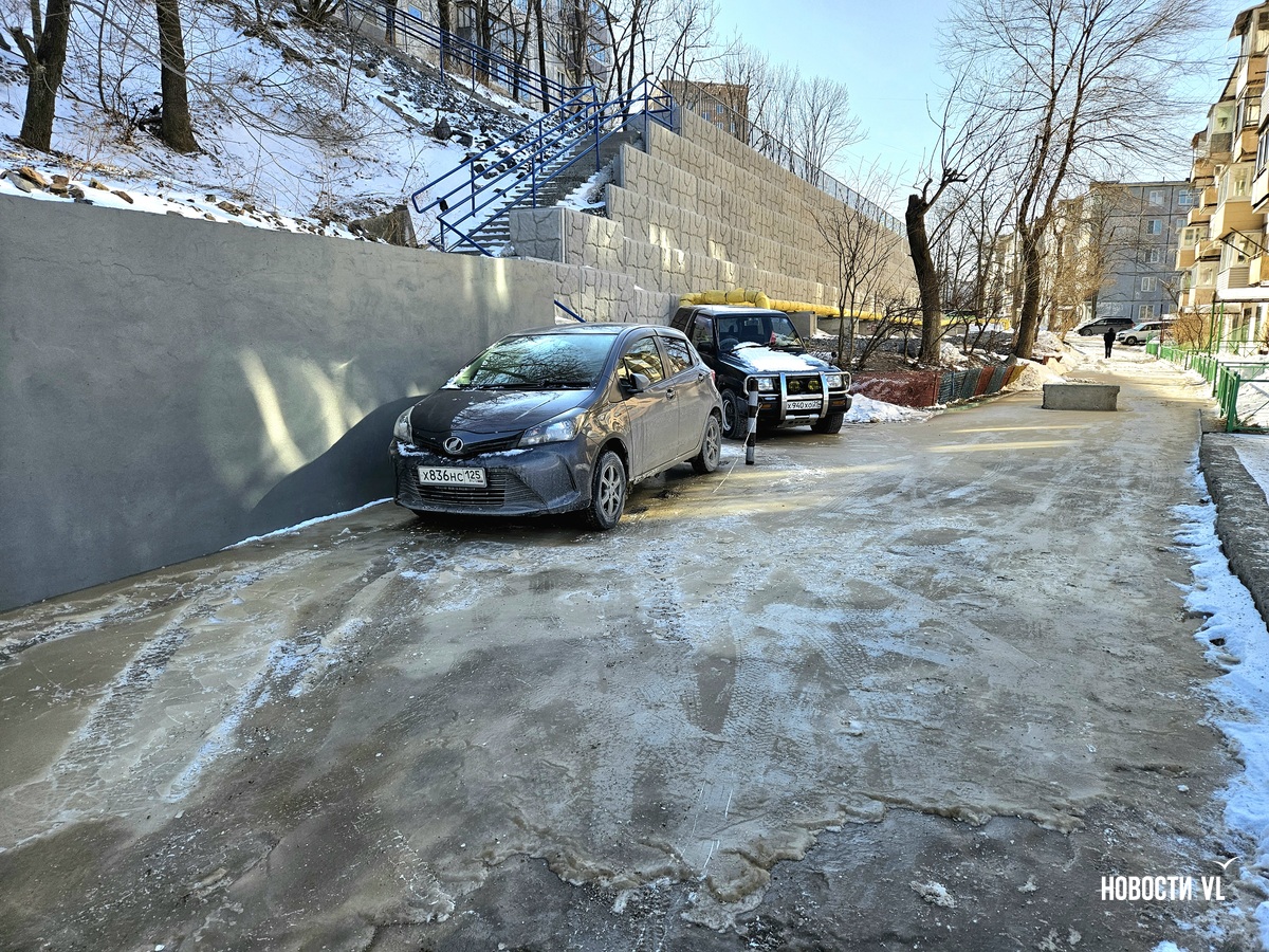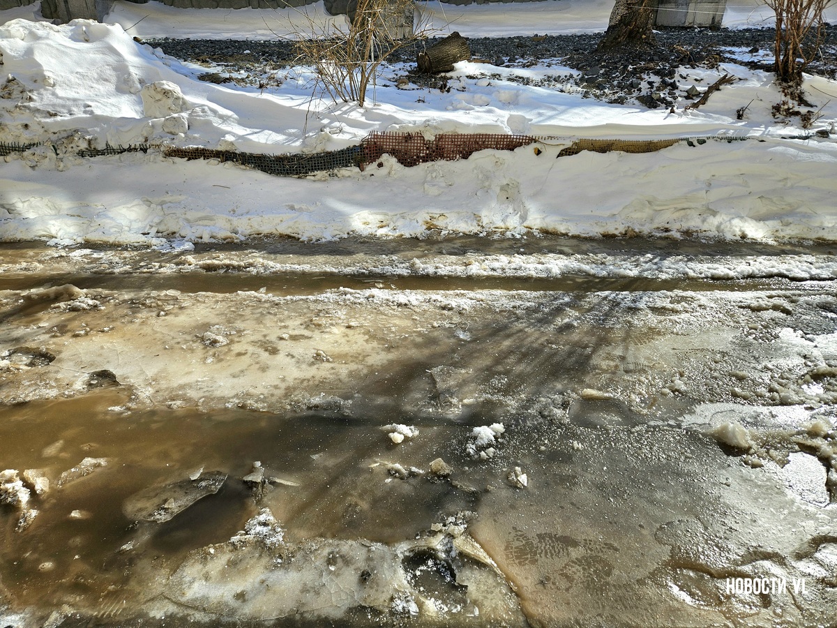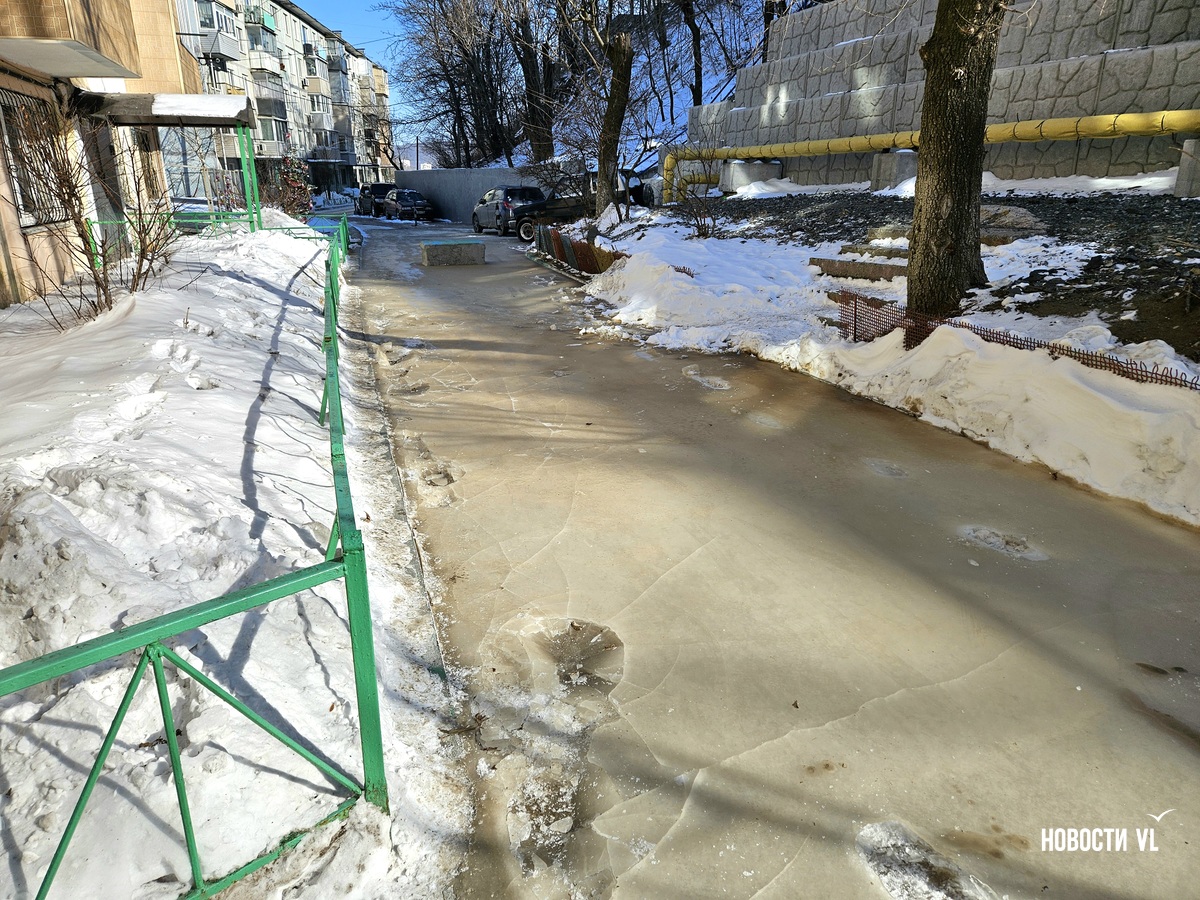 В воздухе стоит резкий запах канализации, а образовавшийся каток – вполне определённого грязно-жёлтого цвета. Сейчас вода уже не бежит. В Примводоканале сообщили, что засор устранили в 11 часов утра. Двор – в плане уборки наледи.