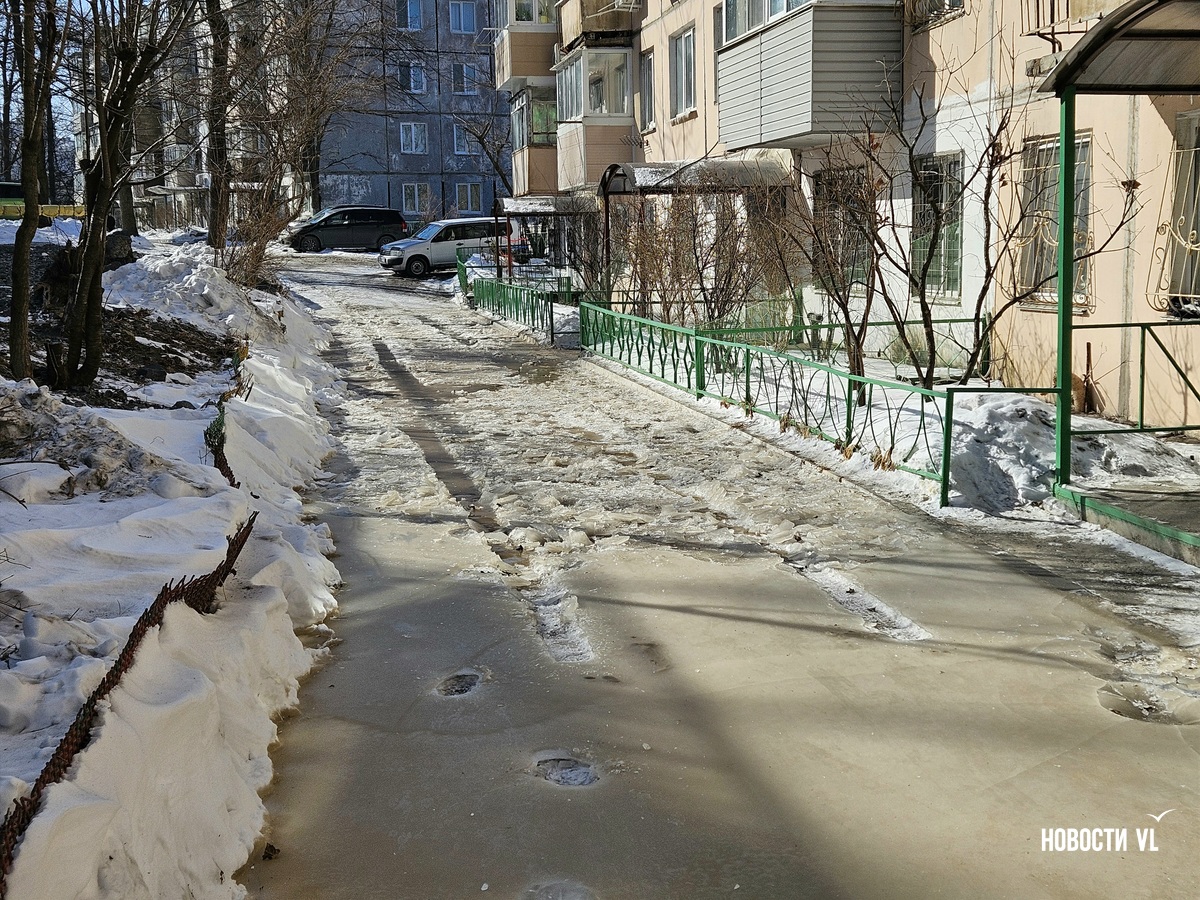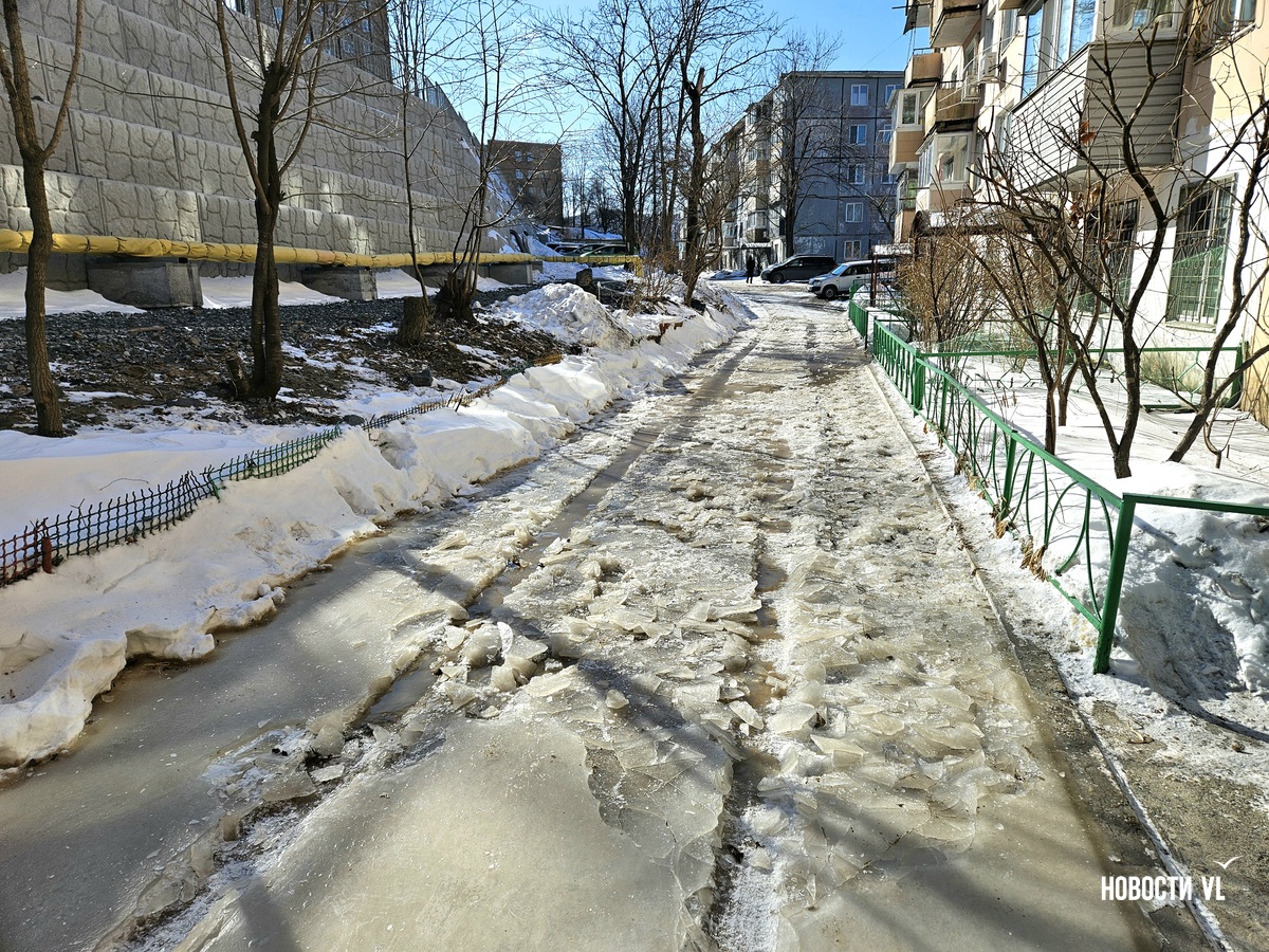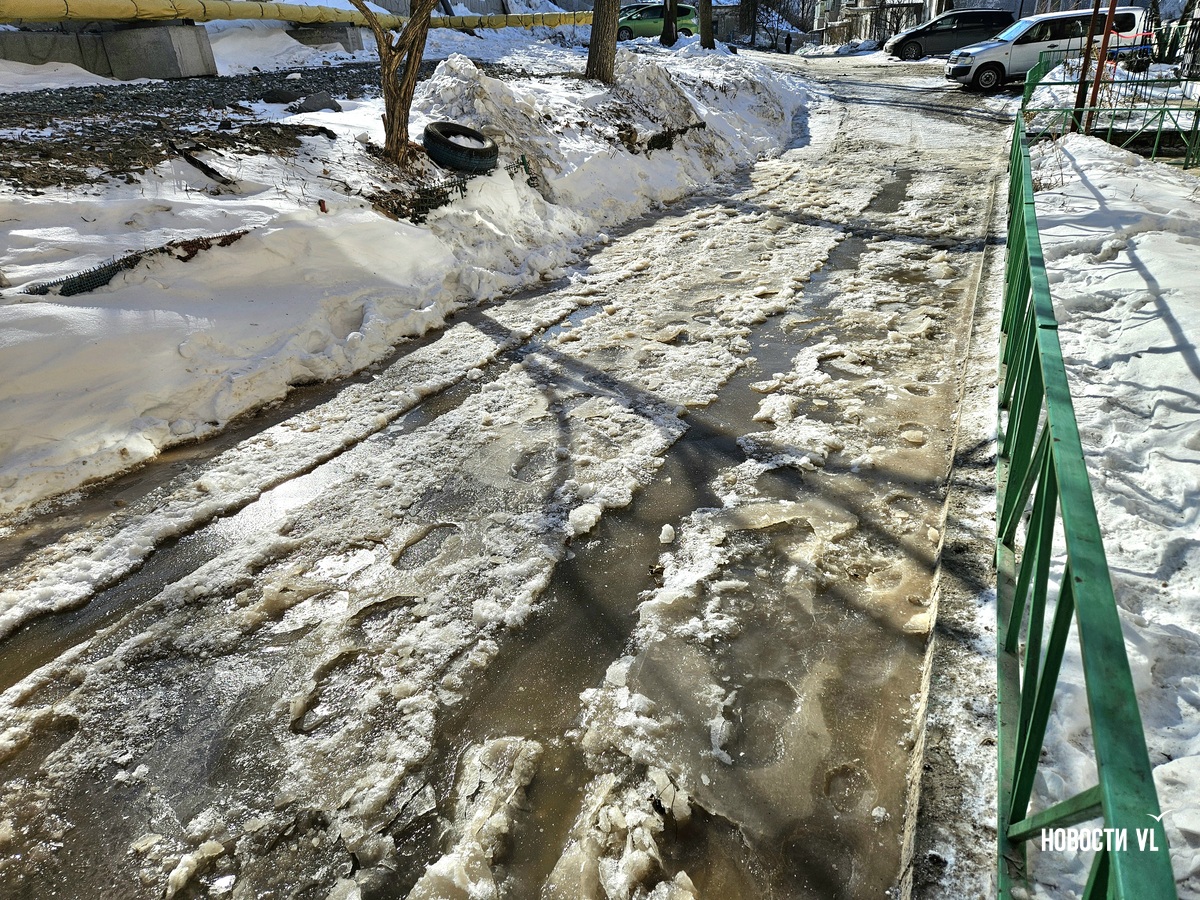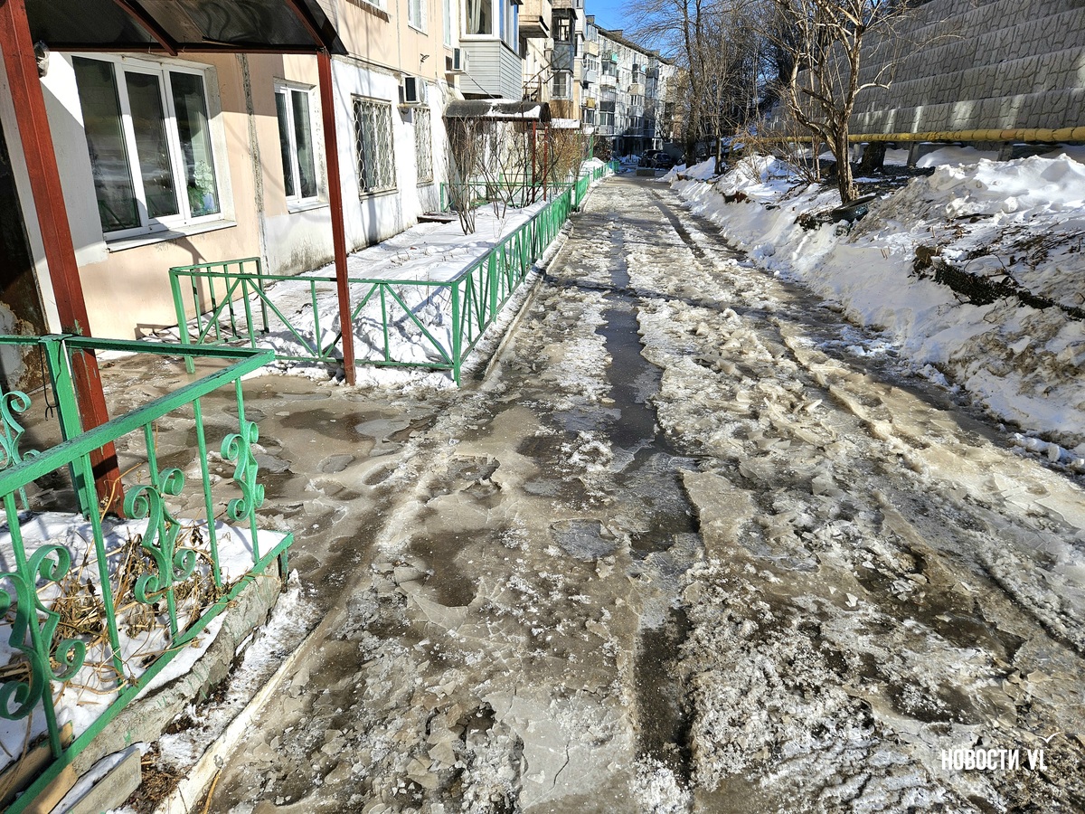 В воздухе стоит резкий запах канализации, а образовавшийся каток – вполне определённого грязно-жёлтого цвета. Сейчас вода уже не бежит. В Примводоканале сообщили, что засор устранили в 11 часов утра. Двор – в плане уборки наледи.