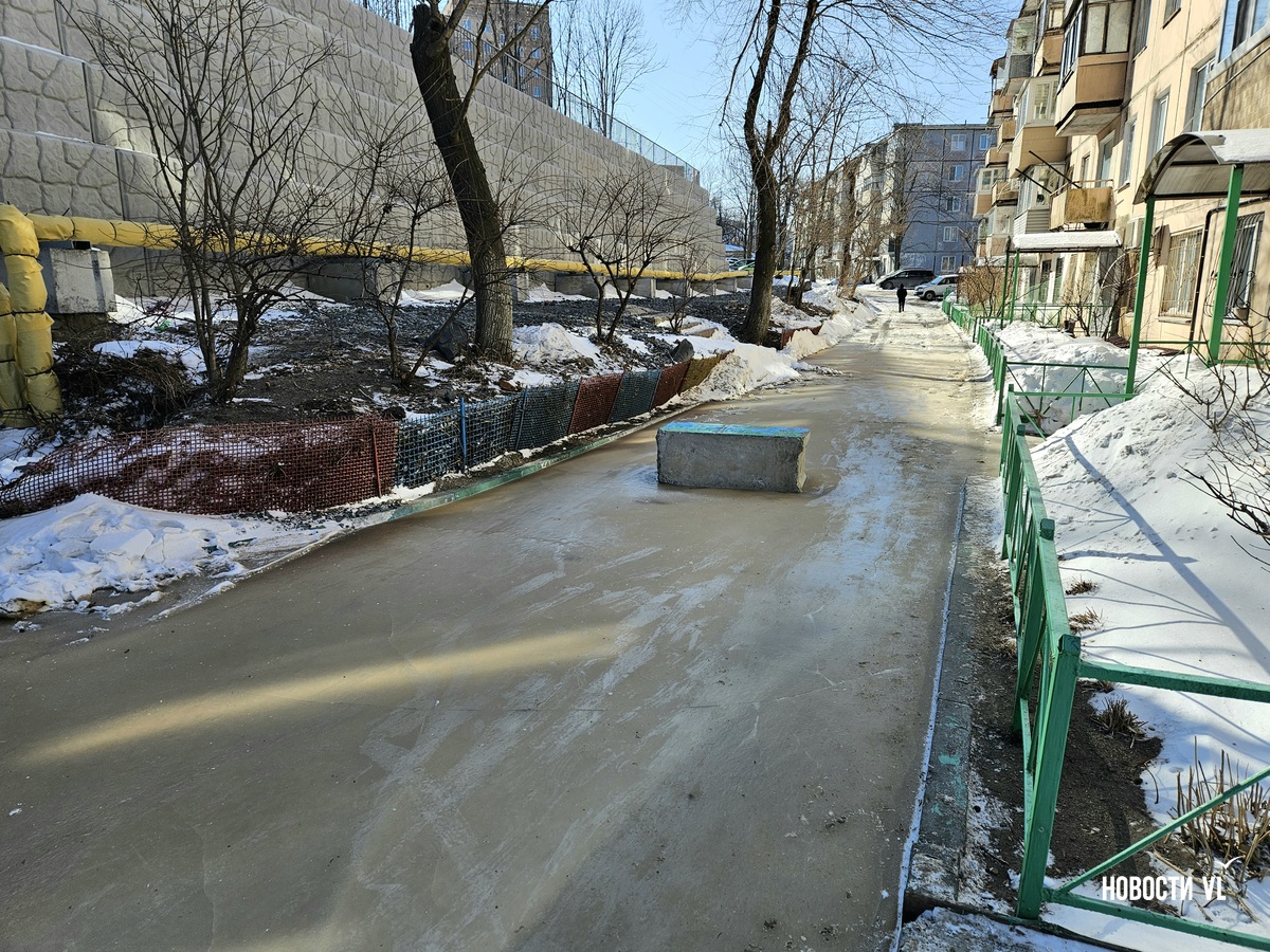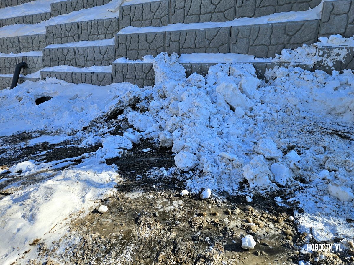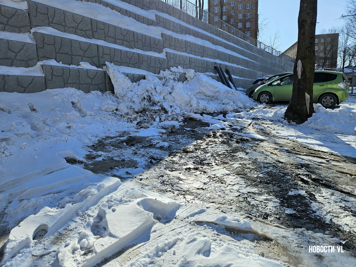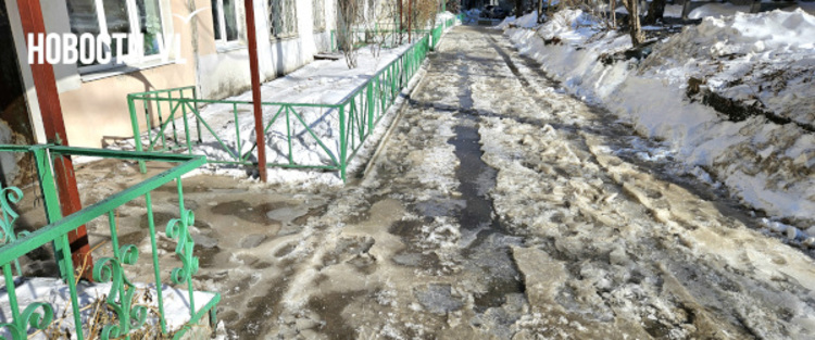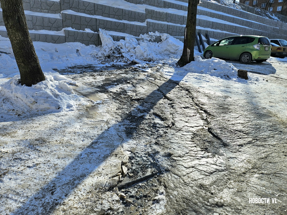 В воздухе стоит резкий запах канализации, а образовавшийся каток – вполне определённого грязно-жёлтого цвета. Сейчас вода уже не бежит. В Примводоканале сообщили, что засор устранили в 11 часов утра. Двор – в плане уборки наледи.