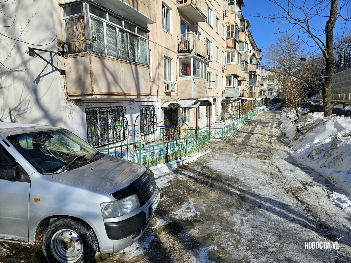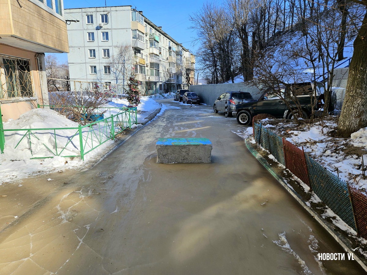 У дома № 58 на Луговой во Владивостоке из-за засора канализации весь двор залило нечистотами. У некоторых подъездов жидкость подобралась вплотную ко входным дверям. Проезд затянут тонкой коркой льда – двигаться здесь невозможно, поэтому он перегорожен бетонными блоками.