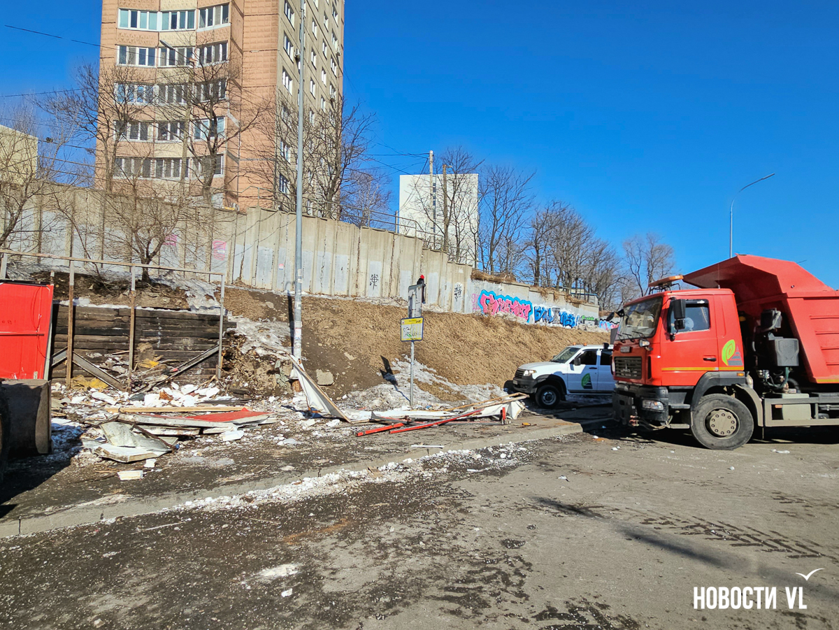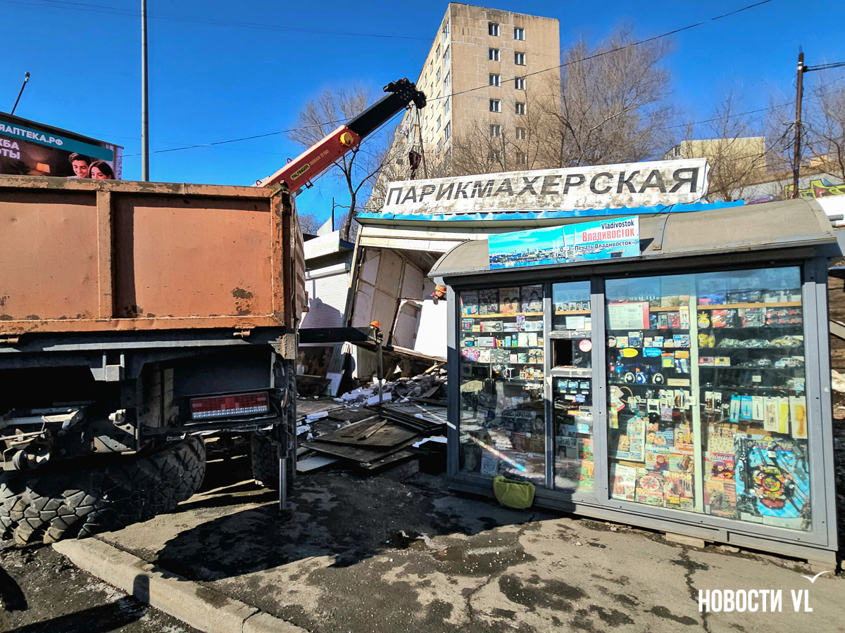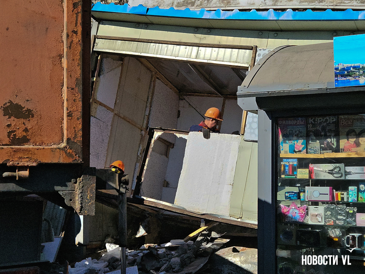 До недавнего времени здесь работал цветочный «Флорита», парикмахерская и продуктовый магазин сети «Мельница». Магазин уже полностью снесён, а большая часть строительного мусора от него вывезена. Павильон парикмахерской и цветочный сносят сейчас. Вероятно, под демонтаж пойдёт и овощной ларёк по соседству. Будут ли сносить павильон «Владпрессы», пока неизвестно.