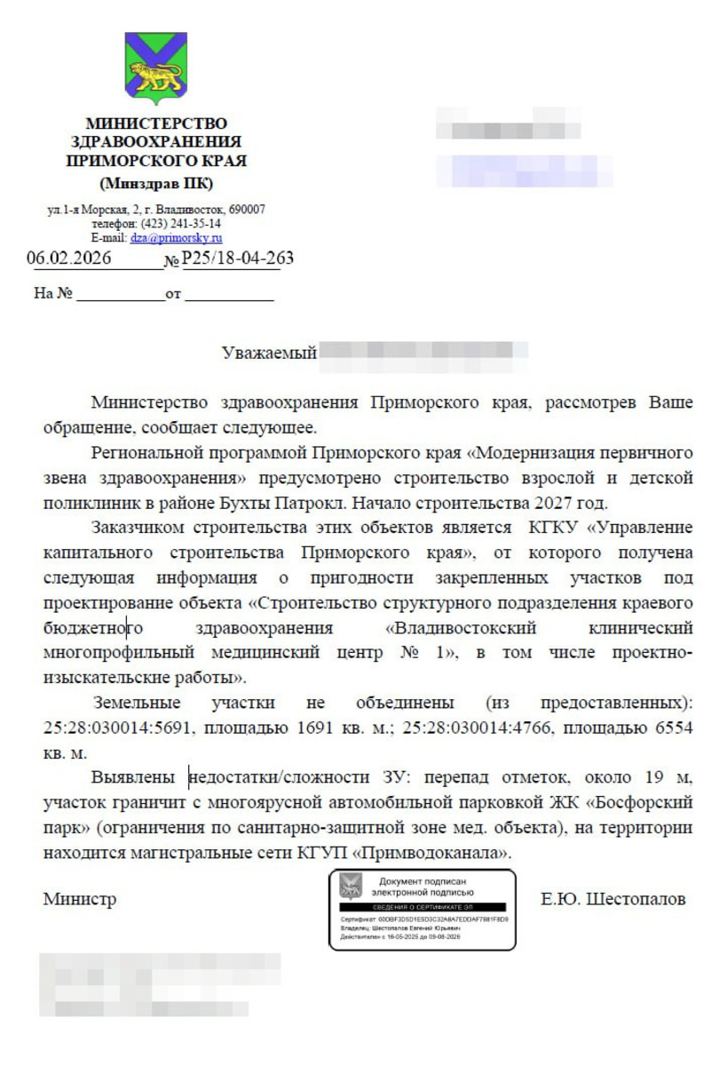 Однако новостей хотя бы о начале проектирования пока так и не было, поэтому патрокловцы сами отправили запрос в минздрав с главным вопросом: что с поликлиникой? И ответ за подписью министра здравоохранения Евгения Шестопалова озадачил. Минздрав подтвердил: региональной программой «Модернизация первичного звена здравоохранения» предусмотрено строительство взрослой и детской поликлиник в районе бухты Патрокл. Начало строительства – 2027 год. Видимо, нужен на проектирование. Заказчик – КГКУ «Управление капитального строительство Приморского края».