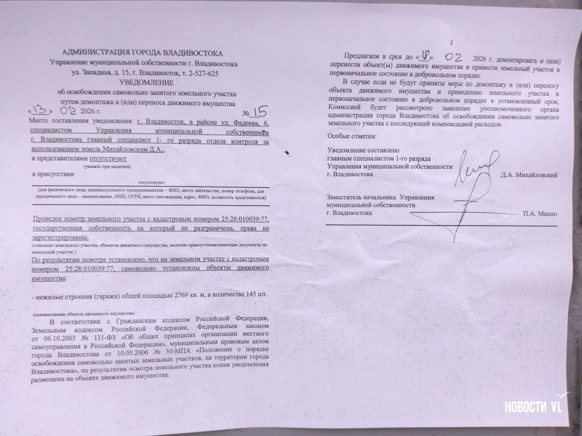 Как указано на сайте мэрии, список самовольно установленных объектов пополнили нежилые строения (гаражи) общей площадью 2769 кв. м в количестве 145 штук на участке 25:28:010039:77. Теперь владельцы должны их вывезти, или это сделают городские службы. Правда, в сообщении мэрии говорится, что владелец не установлен.