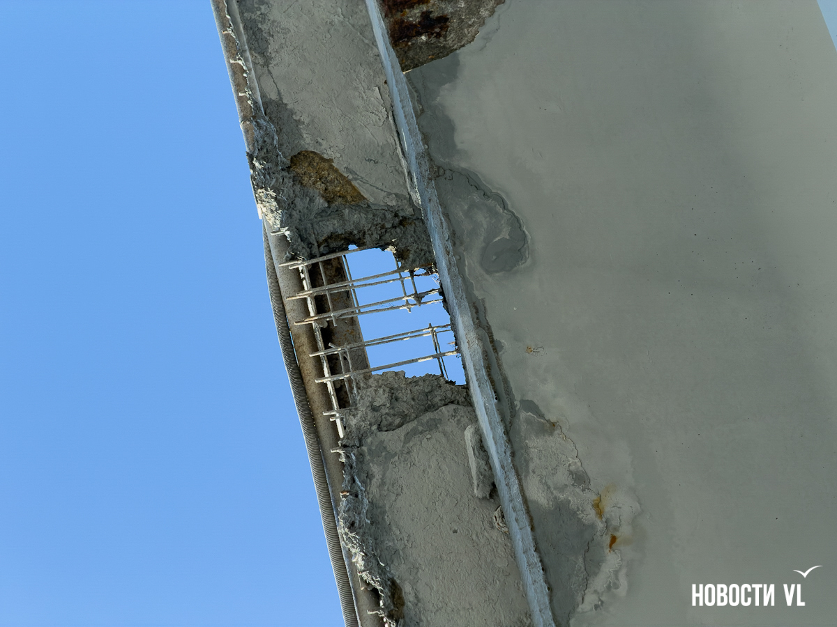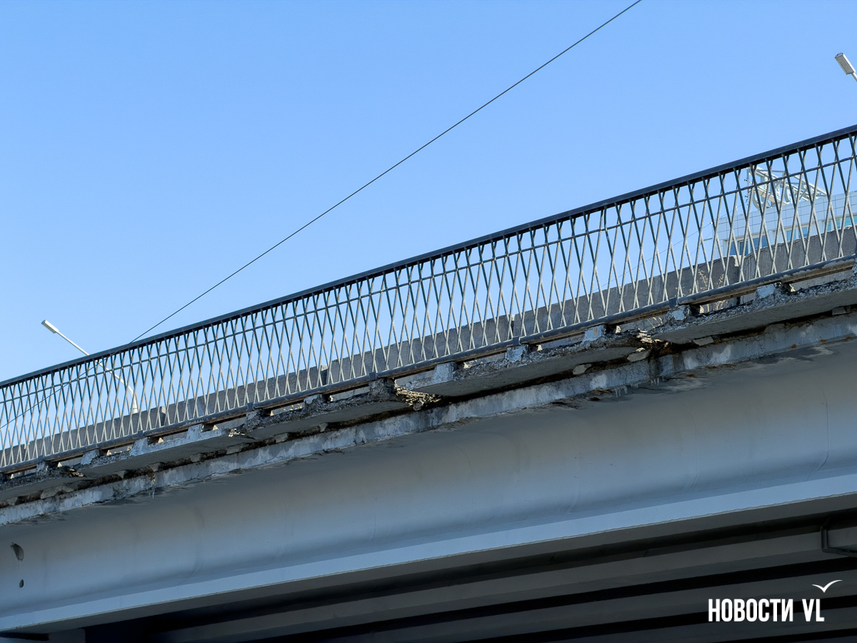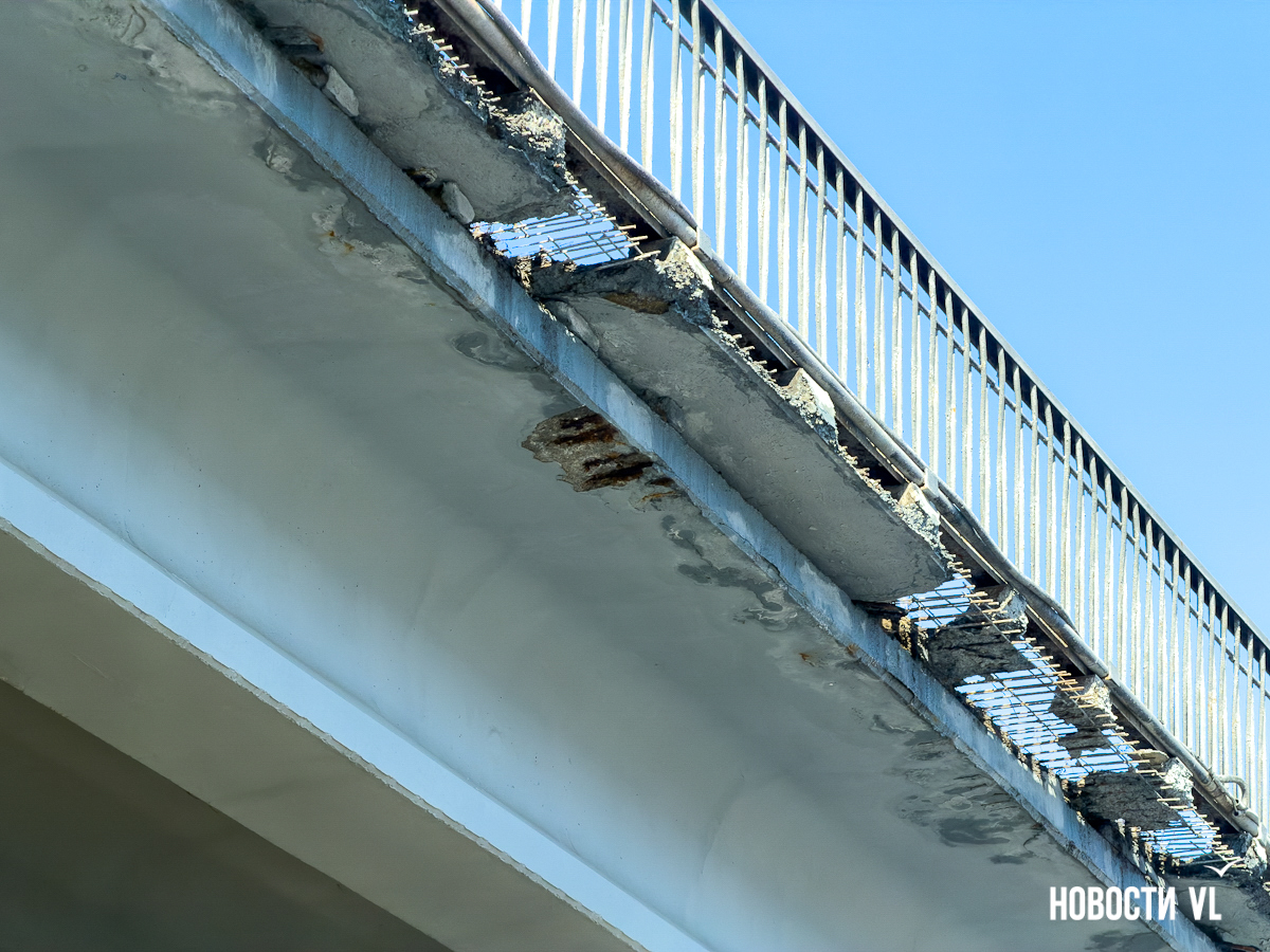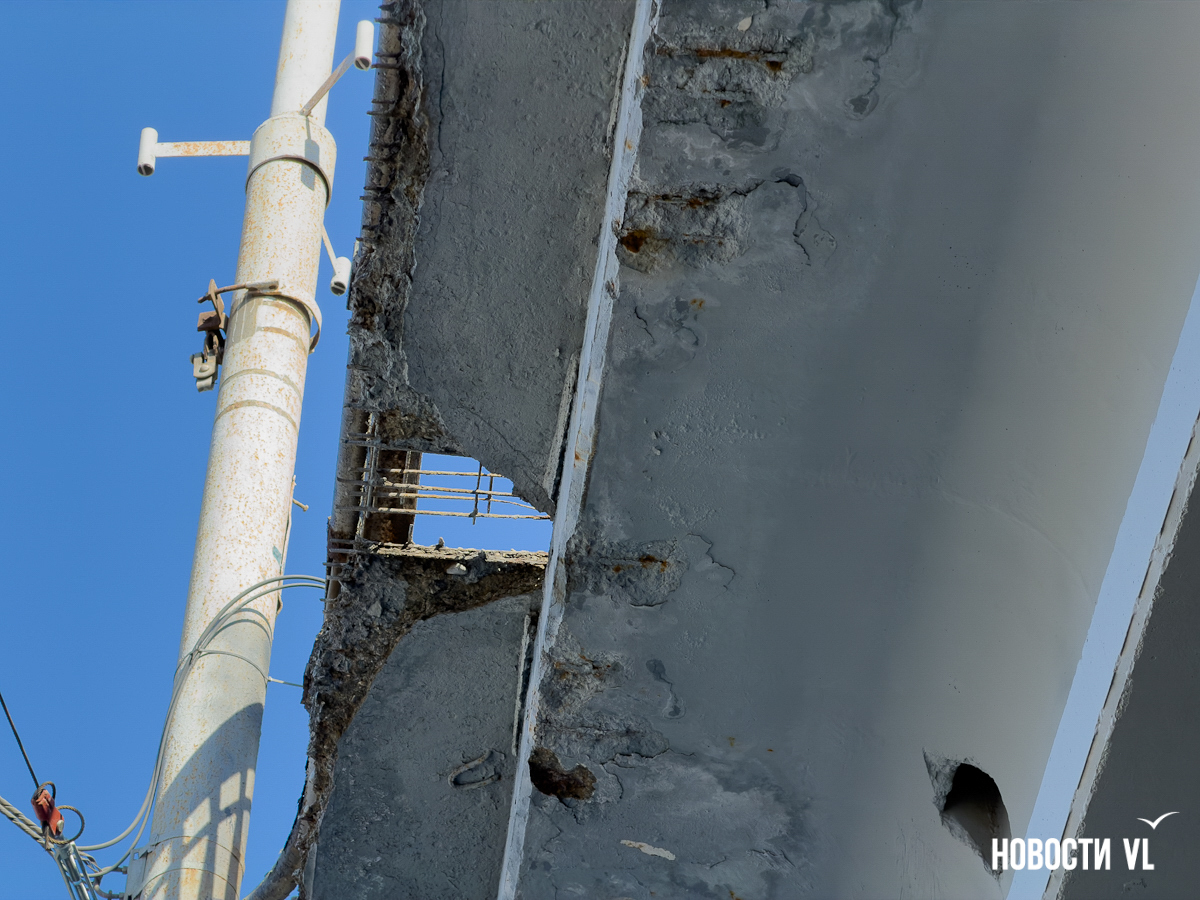 Корреспондент Новостей VL побывал и там, но кусков бетона на дороге не заметил. Зато есть они на недавно отремонтированном тротуаре, где зелёный сигнал светофора ждут пешеходы. Над их головами местами видна ржавая арматура, через дыры в путепроводе можно наблюдать небо.