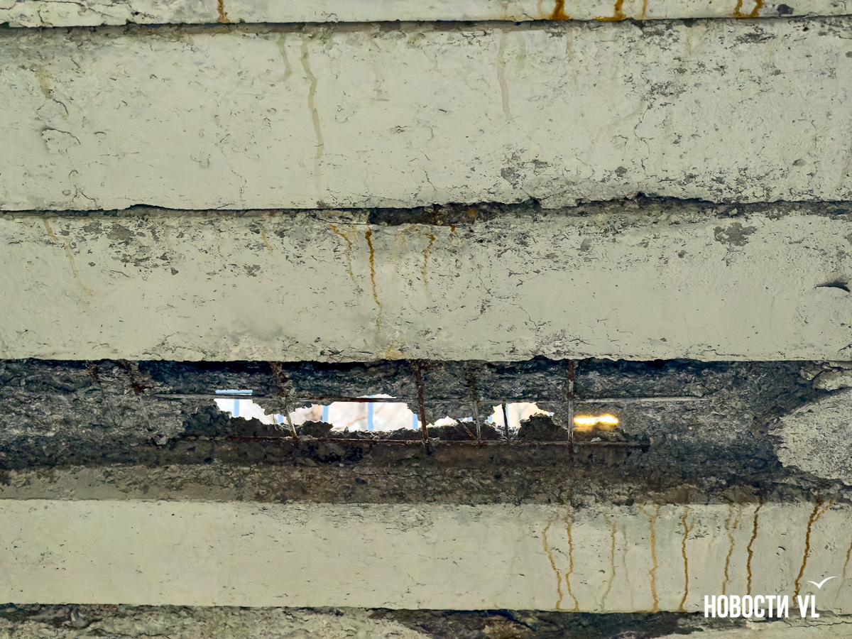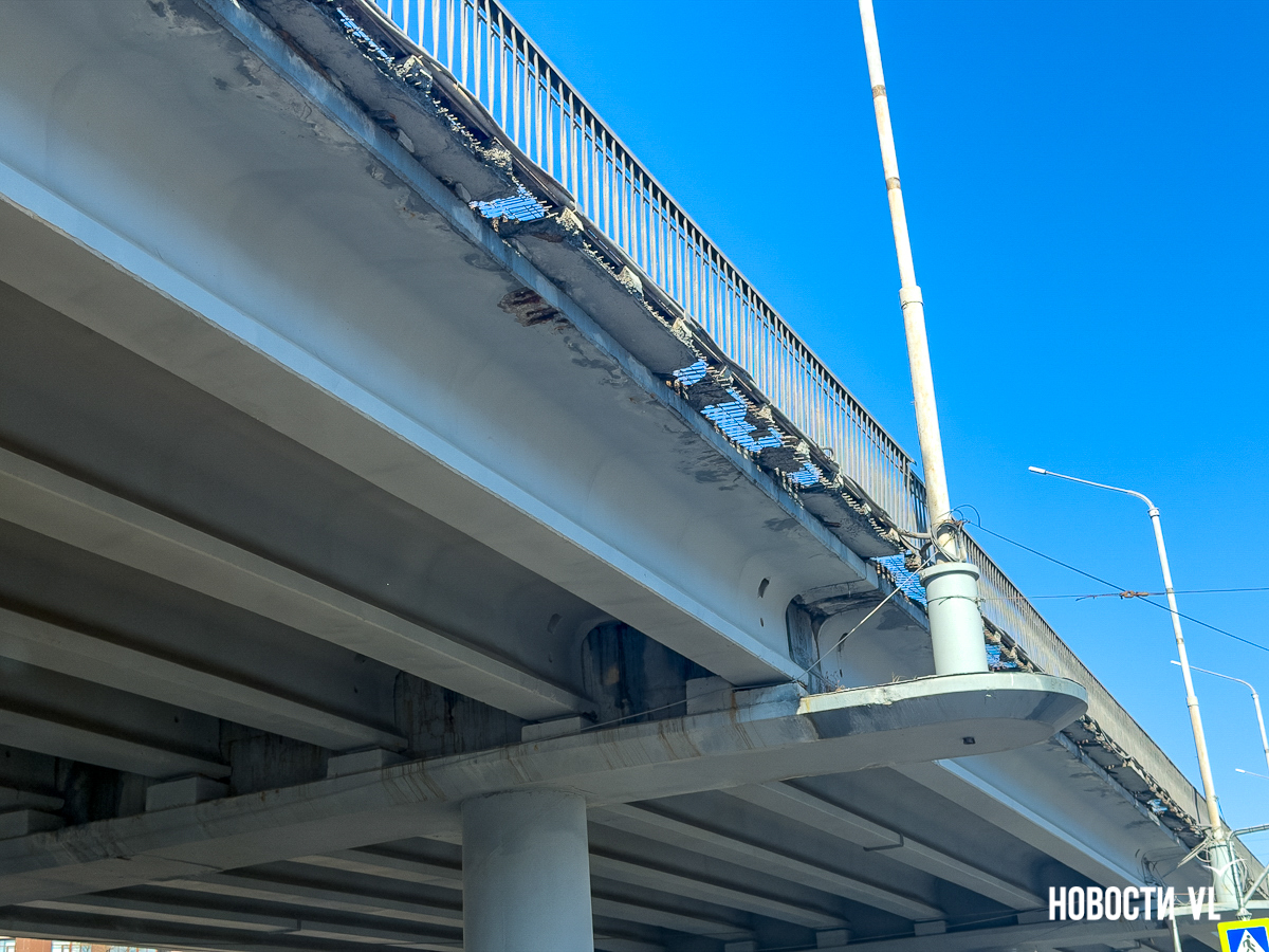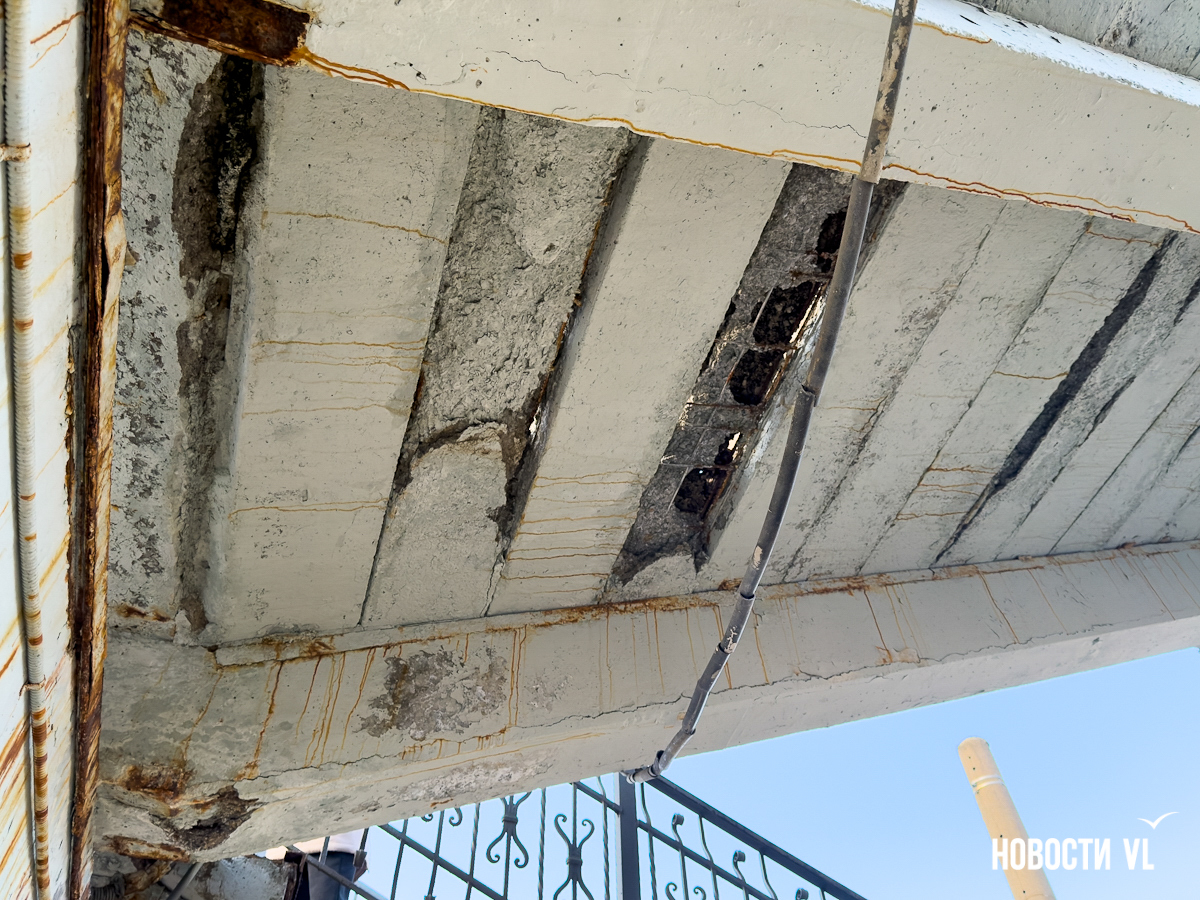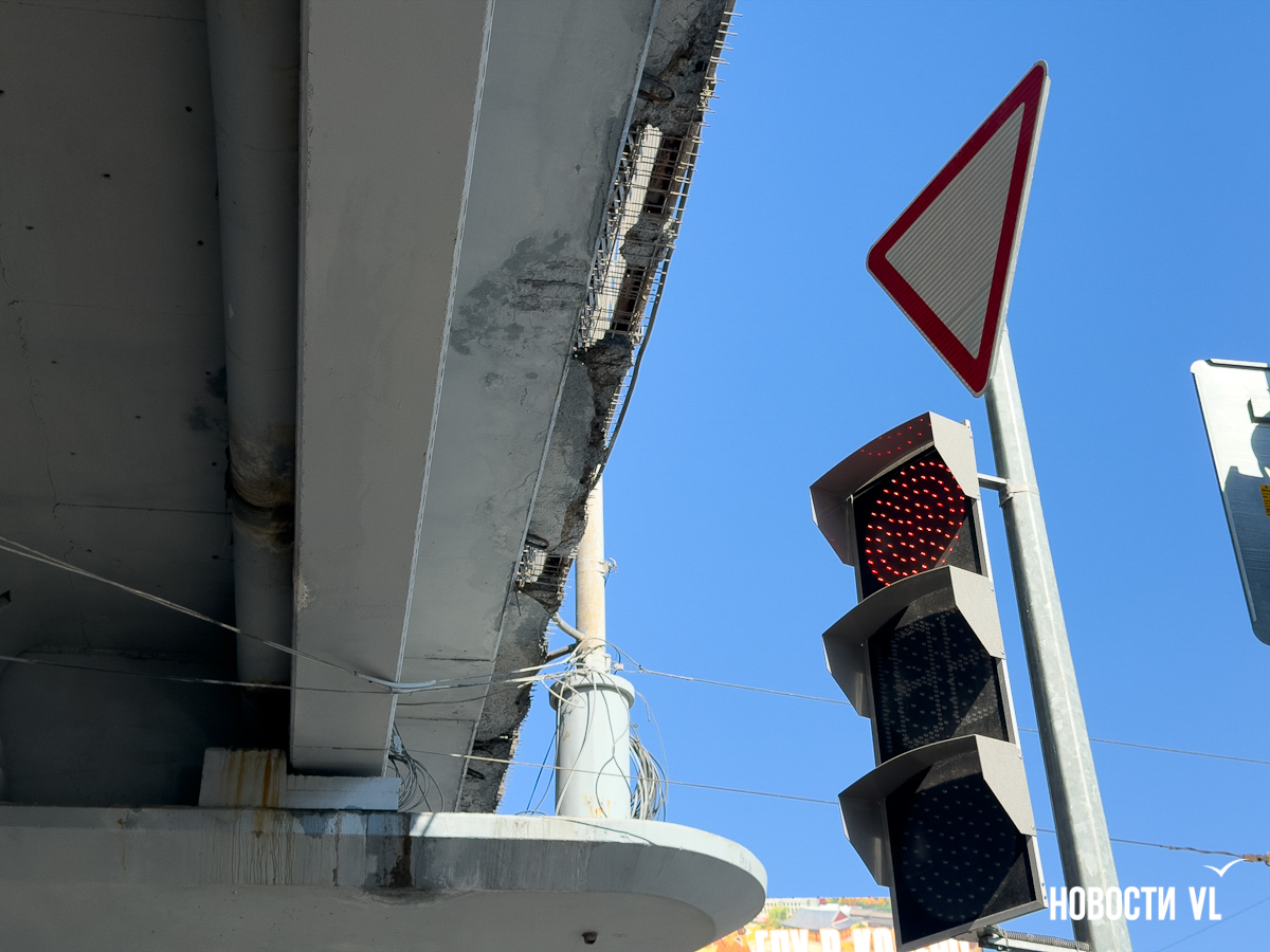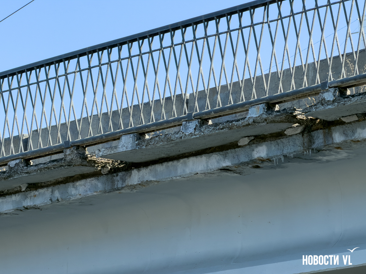 Корреспондент Новостей VL побывал и там, но кусков бетона на дороге не заметил. Зато есть они на недавно отремонтированном тротуаре, где зелёный сигнал светофора ждут пешеходы. Над их головами местами видна ржавая арматура, через дыры в путепроводе можно наблюдать небо.