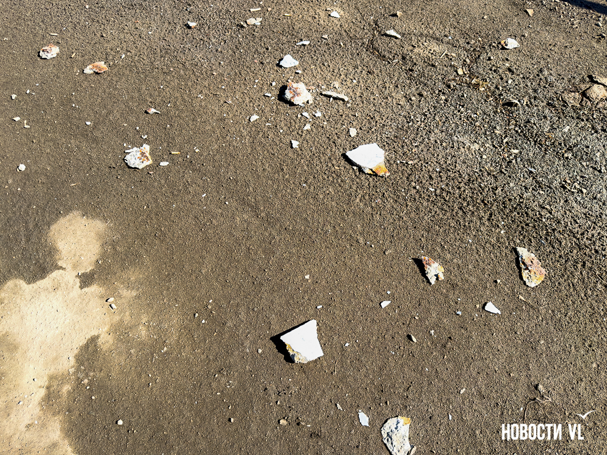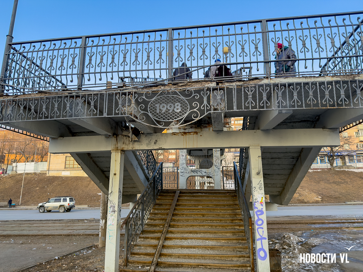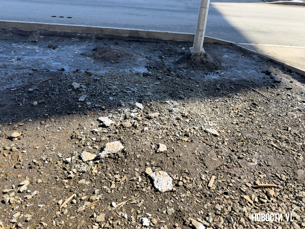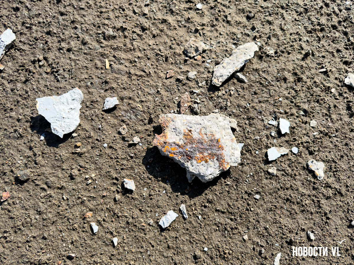 Корреспондент Новостей VL побывал и там, но кусков бетона на дороге не заметил. Зато есть они на недавно отремонтированном тротуаре, где зелёный сигнал светофора ждут пешеходы. Над их головами местами видна ржавая арматура, через дыры в путепроводе можно наблюдать небо.