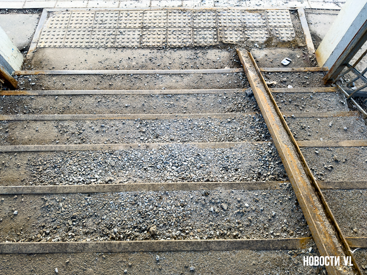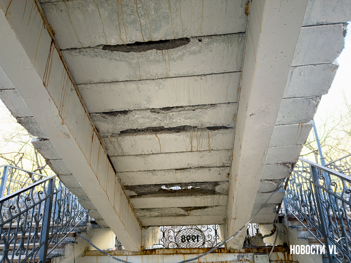 Жители Владивостока пожаловались на виадук через улицу Луговая в районе остановки «Поликлиника», который разрушается у них на глазах. Куски бетона от верхнего пролёта падают на нижний, ступени усыпаны крошкой и крупными камнями. Горожане опасаются, что скоро ходить можно будет только в касках. В мэрии пообещали найти средства на ремонт.