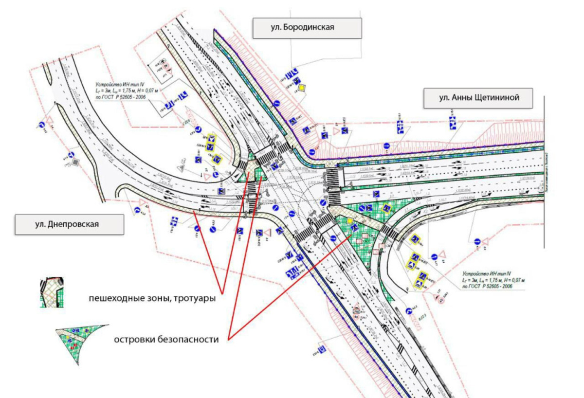 Для автомобилей, поворачивающих с Выселковой на Анны Щетининой, будет выделена крайняя правая полоса для непрерывного проезда, съезд на поворотную полосу будет до светофора. Для безопасности пешеходов появятся тротуары и наземные пешеходные переходы, на пересечении улиц Анны Щетининой, Днепровской и Бородинской – два островка безопасности, через которые будет организовано непрерывное пешеходное пространство. На участке установят знаки направления движения, между встречными транспортными потоками нанесут разделительные полосы.