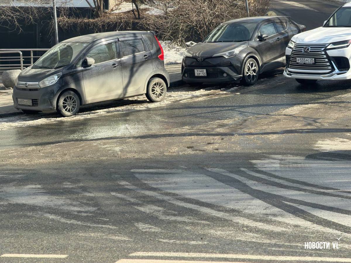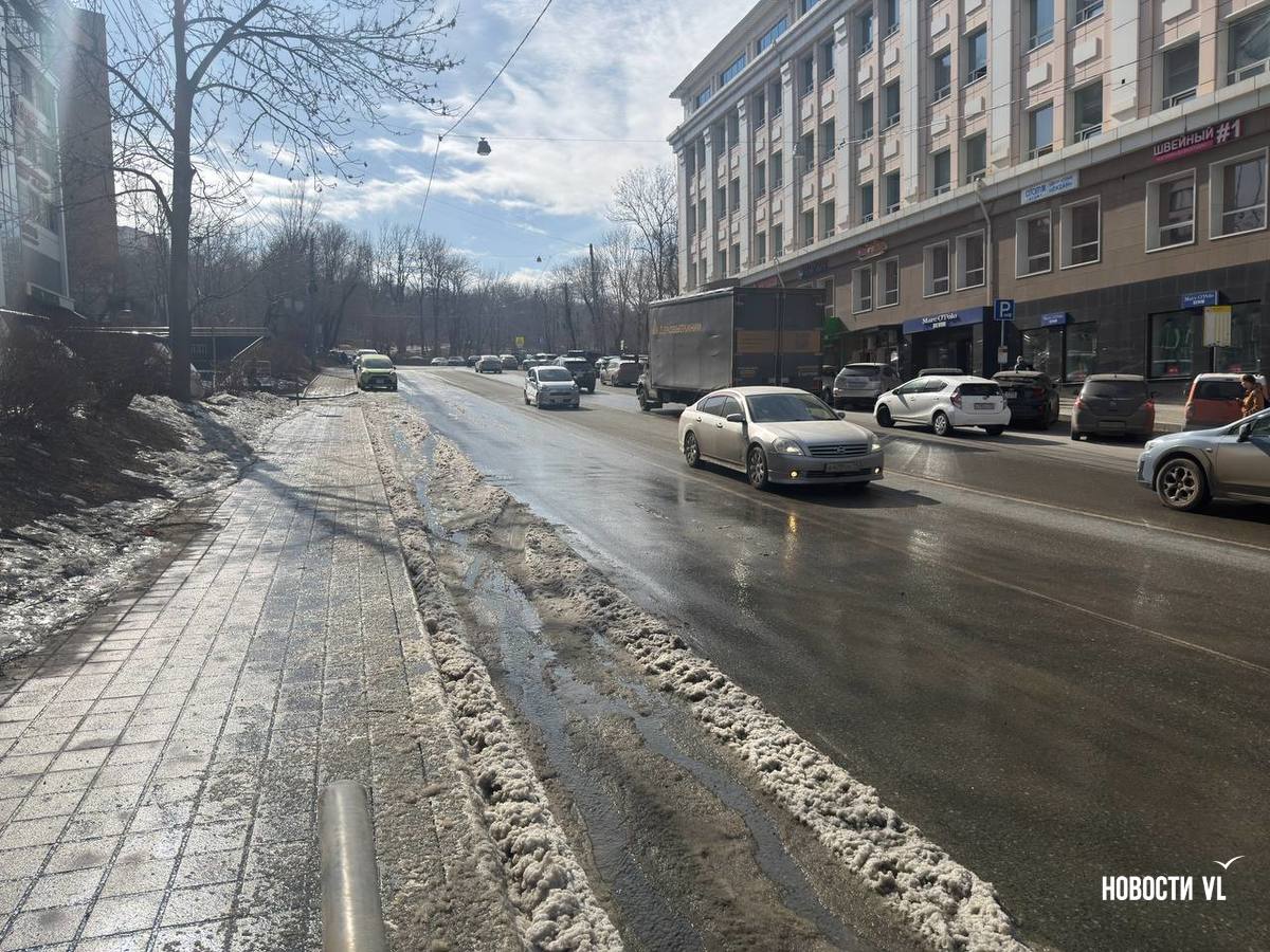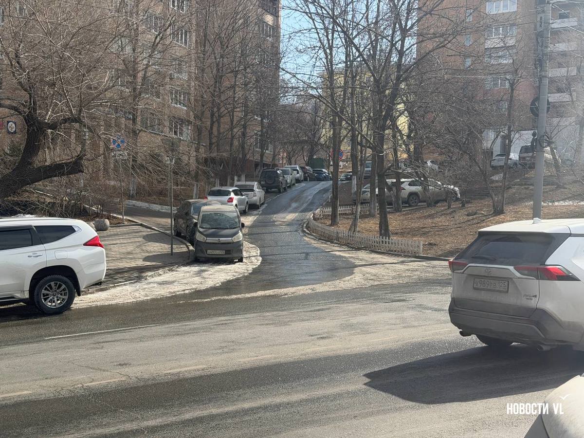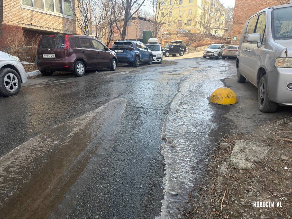 Канализационными водами залило всю улицу Московскую, вниз по склону стоки стекают на Океанский проспект, замерзая у обочины. Колёса некоторых машин уже во льду. Проспект залит почти до перекрёстка с Красного Знамени. Из-за обледеневшей дороги местами водителей заносит, а тормозной путь увеличивается.