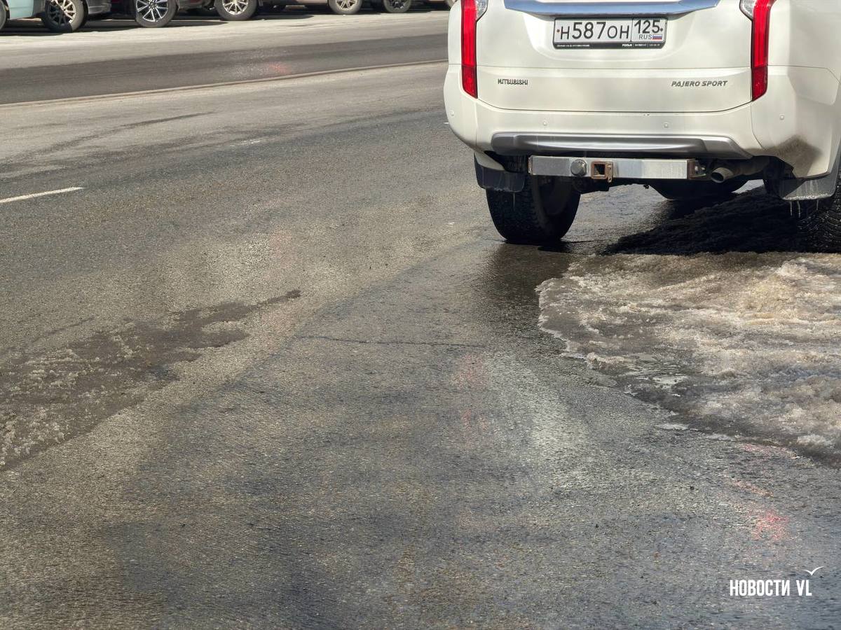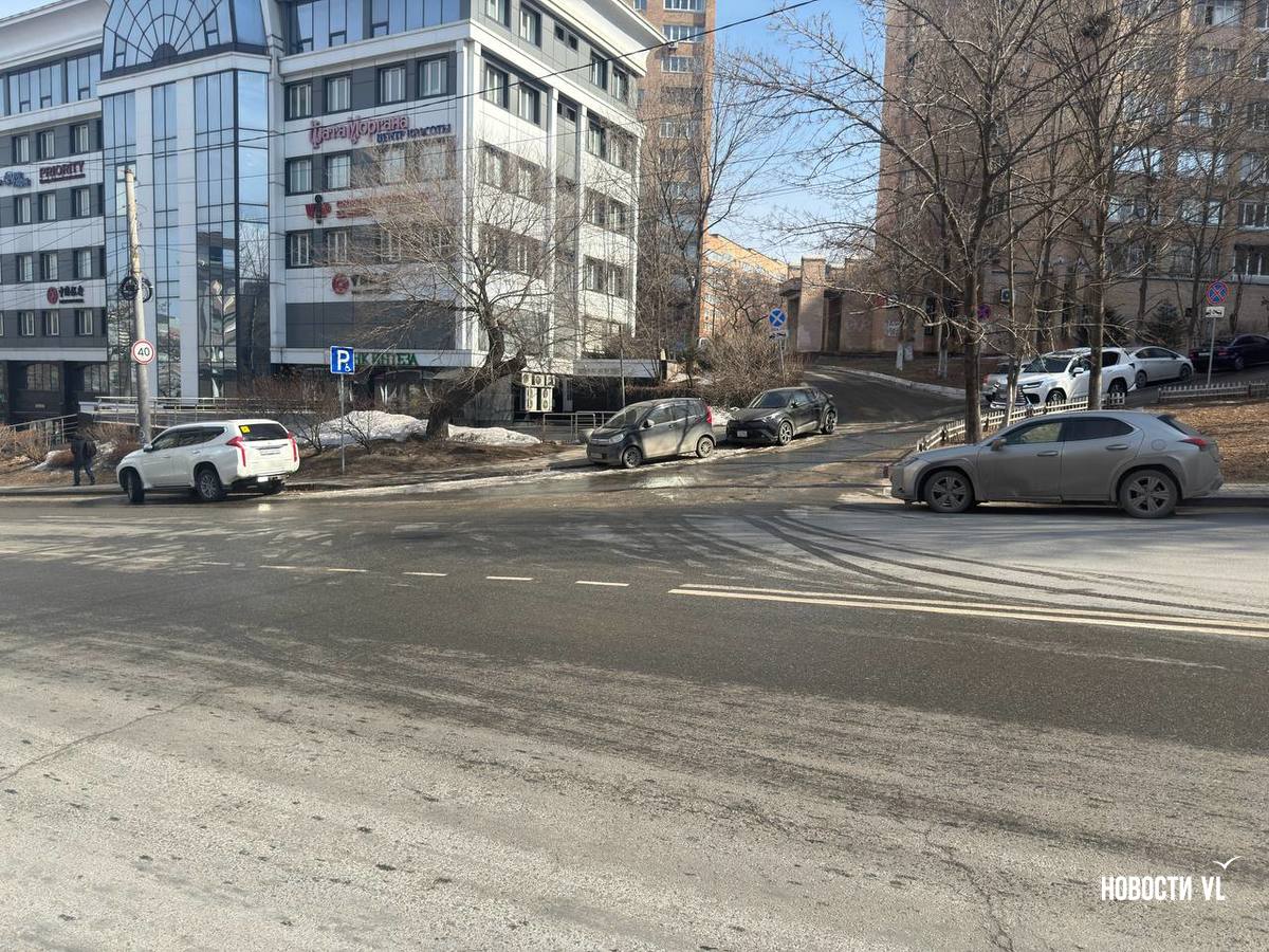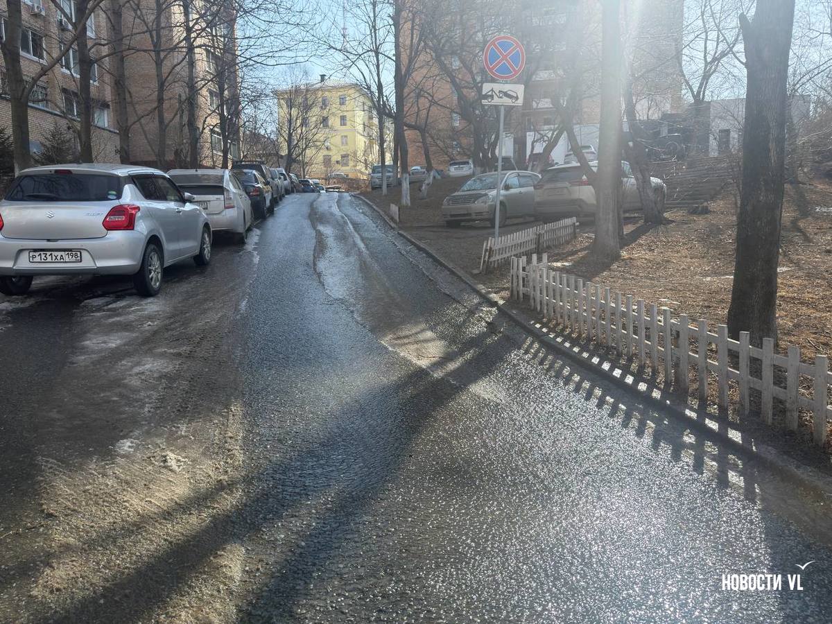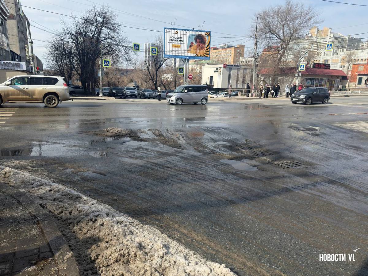 Канализационными водами залило всю улицу Московскую, вниз по склону стоки стекают на Океанский проспект, замерзая у обочины. Колёса некоторых машин уже во льду. Проспект залит почти до перекрёстка с Красного Знамени. Из-за обледеневшей дороги местами водителей заносит, а тормозной путь увеличивается.