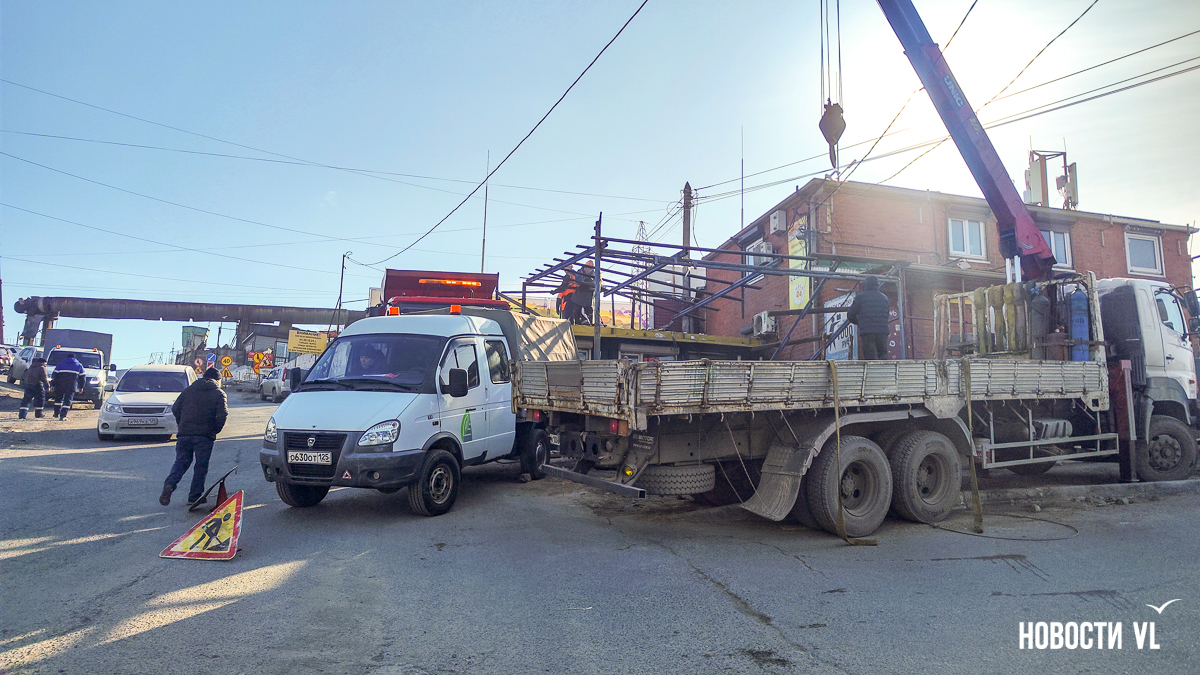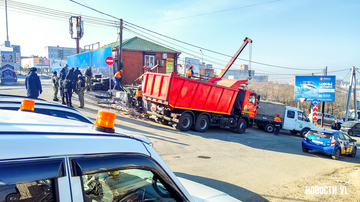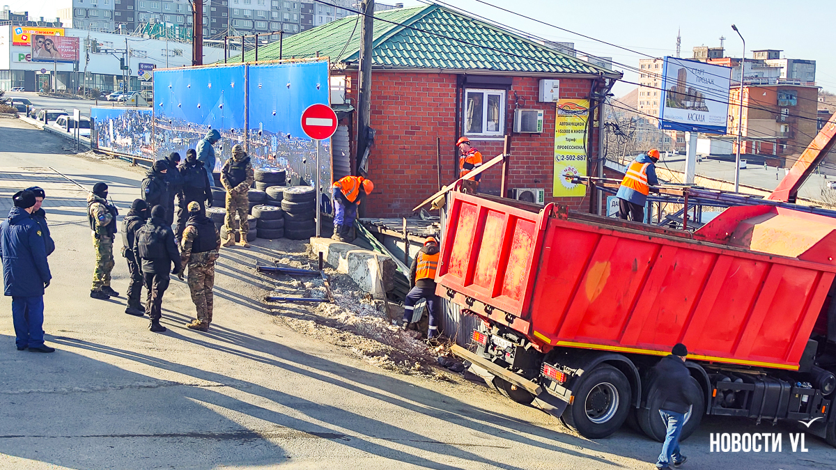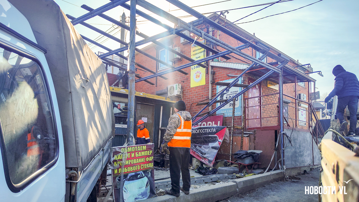 В среду, 25 февраля, сотрудники СГТ демонтировали шиномонтажку на проезде к авторынку «Зелёный угол», которая работала здесь не один год. Утром сюда приехало сразу несколько грузовиков, с десяток рабочих и ещё больше охранников. Разбирали и разрезали металлоконструкции оперативно при помощи газового резака. Что не могли поднять руками, закидывали в кузов грузовика при помощи крана. Также по плану должны снести соседнее автокафе и ресторанчик на Ладыгина.