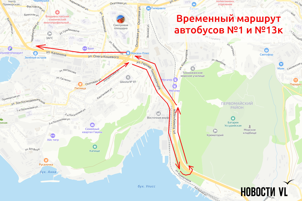 Изменили на время ремонта свои маршруты и автобусы № 1, 13К, 49 и 30К. Автобусы маршрутов № 1 и 13К, двигаясь со стороны остановки «Змеинка», после «Дома ребёнка» будут поворачивать в сторону улицы Героев-Тихоокеанцев, затем разворачиваться после «Катерной», двигаясь в обратном направлении до «Бурачка», и далее двигаться по основной схеме. Автобусы маршрутов № 49 и 30К, двигаясь со стороны Вилкова, будут доезжать до кольца Терешковой без поворота на Окатовую и затем, поворачивая на улицу Терешковой, проезжая улицу Бурачка, будут выходить на остановку «Бурачка» и далее по ранее установленной схеме.