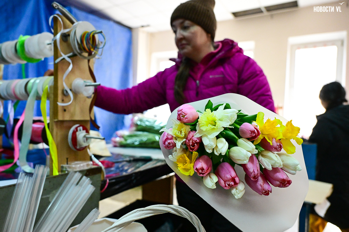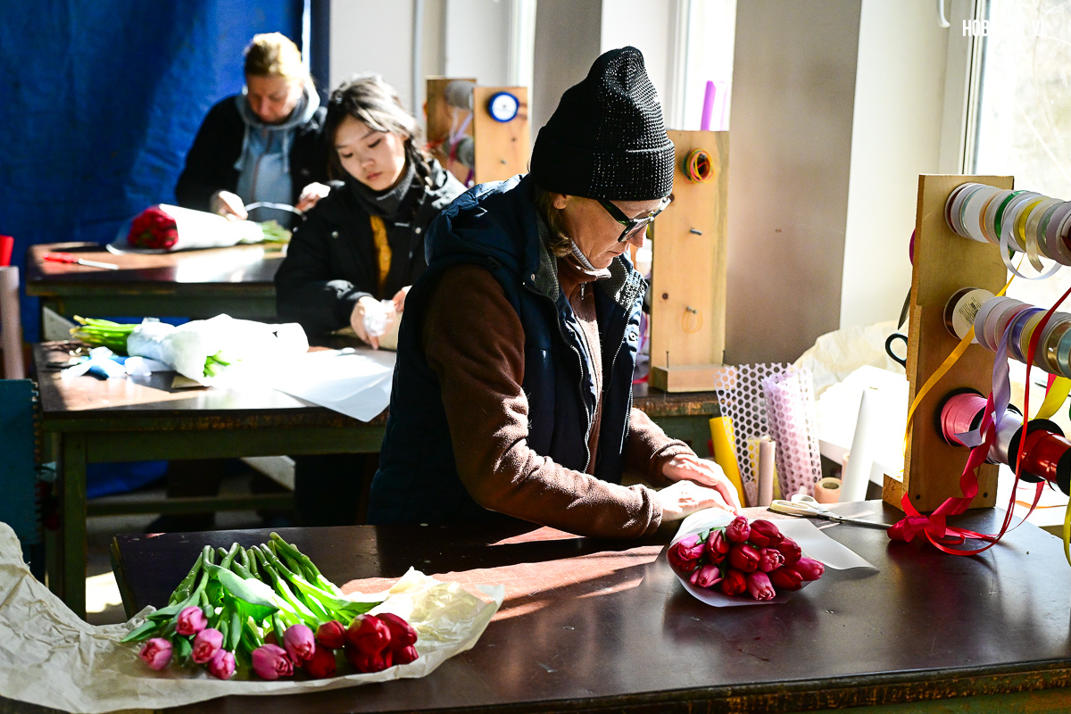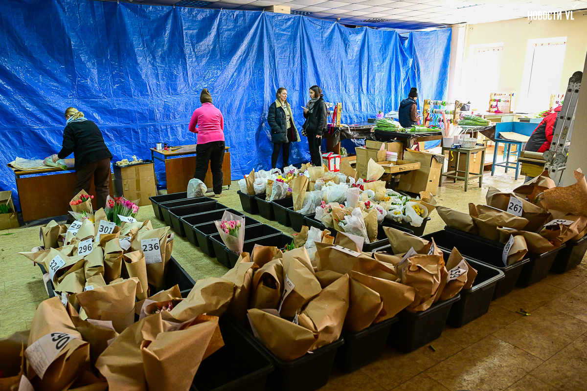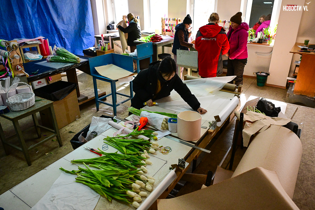 В предпраздничное утро в бывшем заводском помещении развернулась настоящая «цветочная фабрика». На столах со знанием дела заворачивают букеты, среди сотен тюльпанов ищут определённые сорта, а у импровизированной кассы стоят мужчины-покупатели, утопающие в ярких цветах и выглядывающие через веточки мимозы.