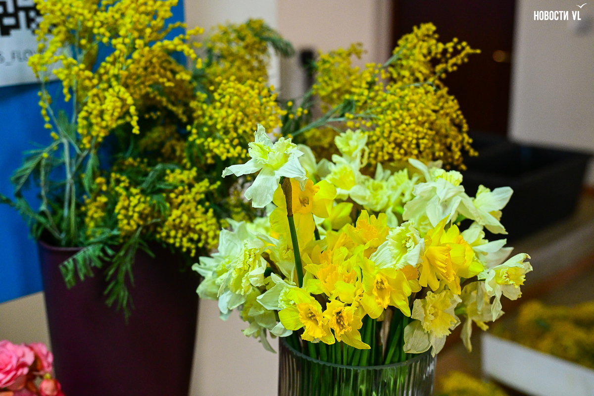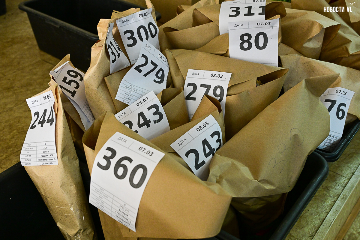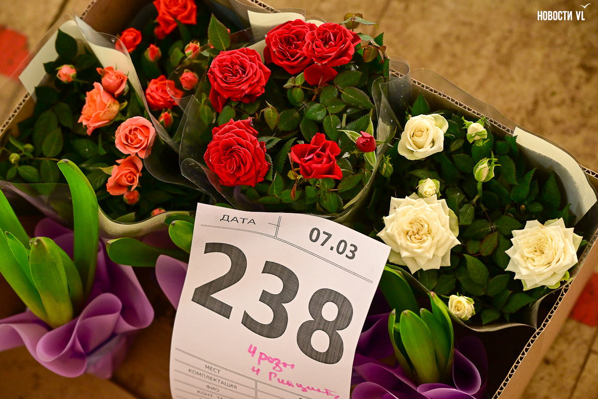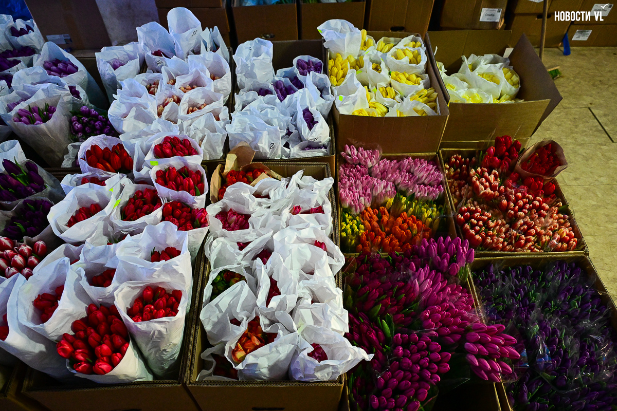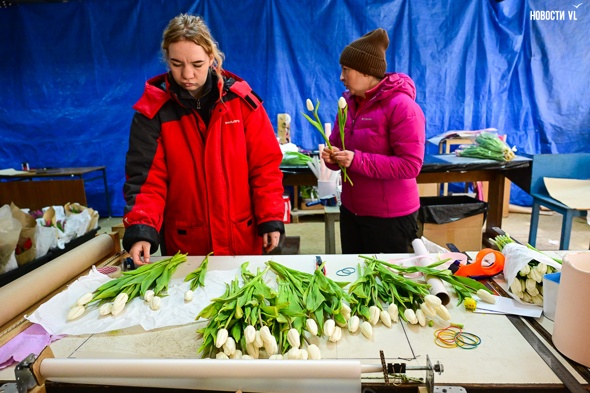 В предпраздничное утро в бывшем заводском помещении развернулась настоящая «цветочная фабрика». На столах со знанием дела заворачивают букеты, среди сотен тюльпанов ищут определённые сорта, а у импровизированной кассы стоят мужчины-покупатели, утопающие в ярких цветах и выглядывающие через веточки мимозы.