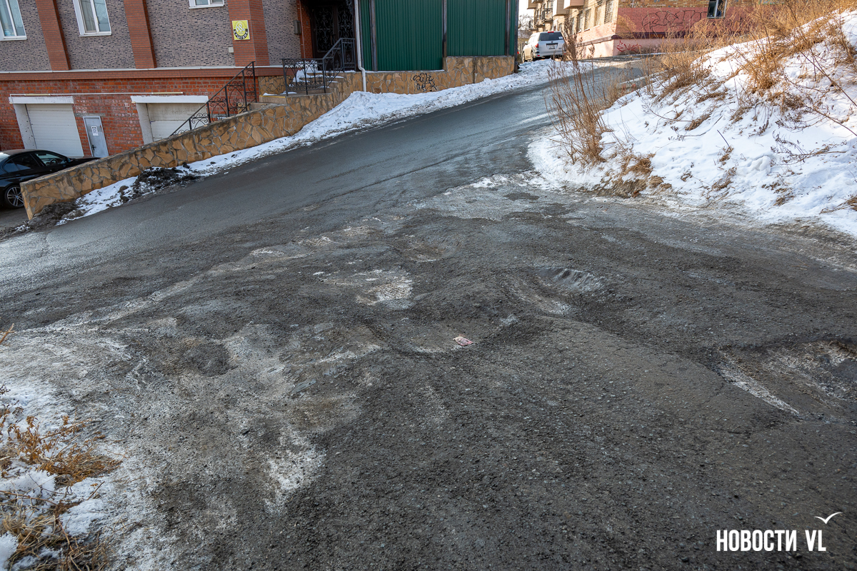 Прокуратура тоже обнаружила ямы и выбоины на участке от Крыгина, 42 до Леонова, 70 и ещё в 2024 году внесла представление главе города, которое осталось без удовлетворения. Сооружение находится в границах муниципального земельного участка с кадастровым номером 25:28:000000:9275. Это дорога общего пользования местного значения. Город признал необходимость комплексного ремонта, но пока работы не начинались. В 2025 году мэрия сообщала, что чинить ничего не будет ввиду нехватки средств, а если средства и найдутся, то рассчитывать жители могут только на подсыпку асфальтовой крошкой, устройство тротуаров на этой дороге в любом случае не планируется.