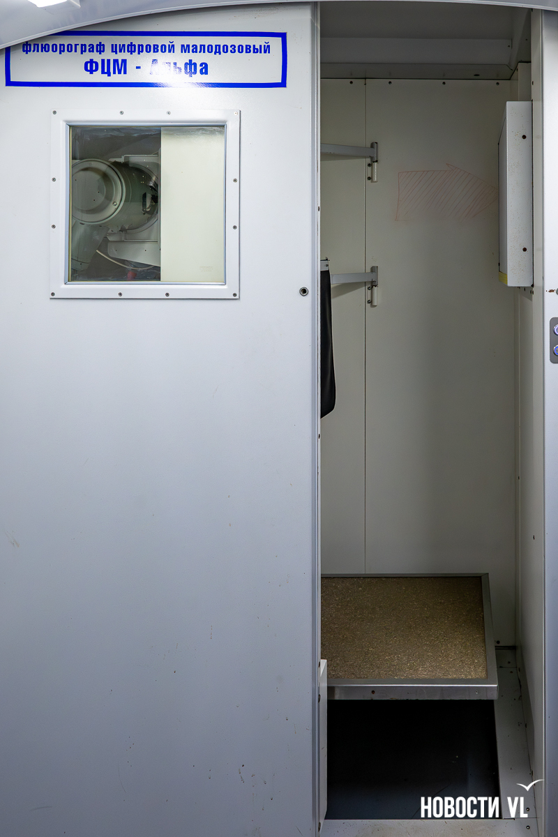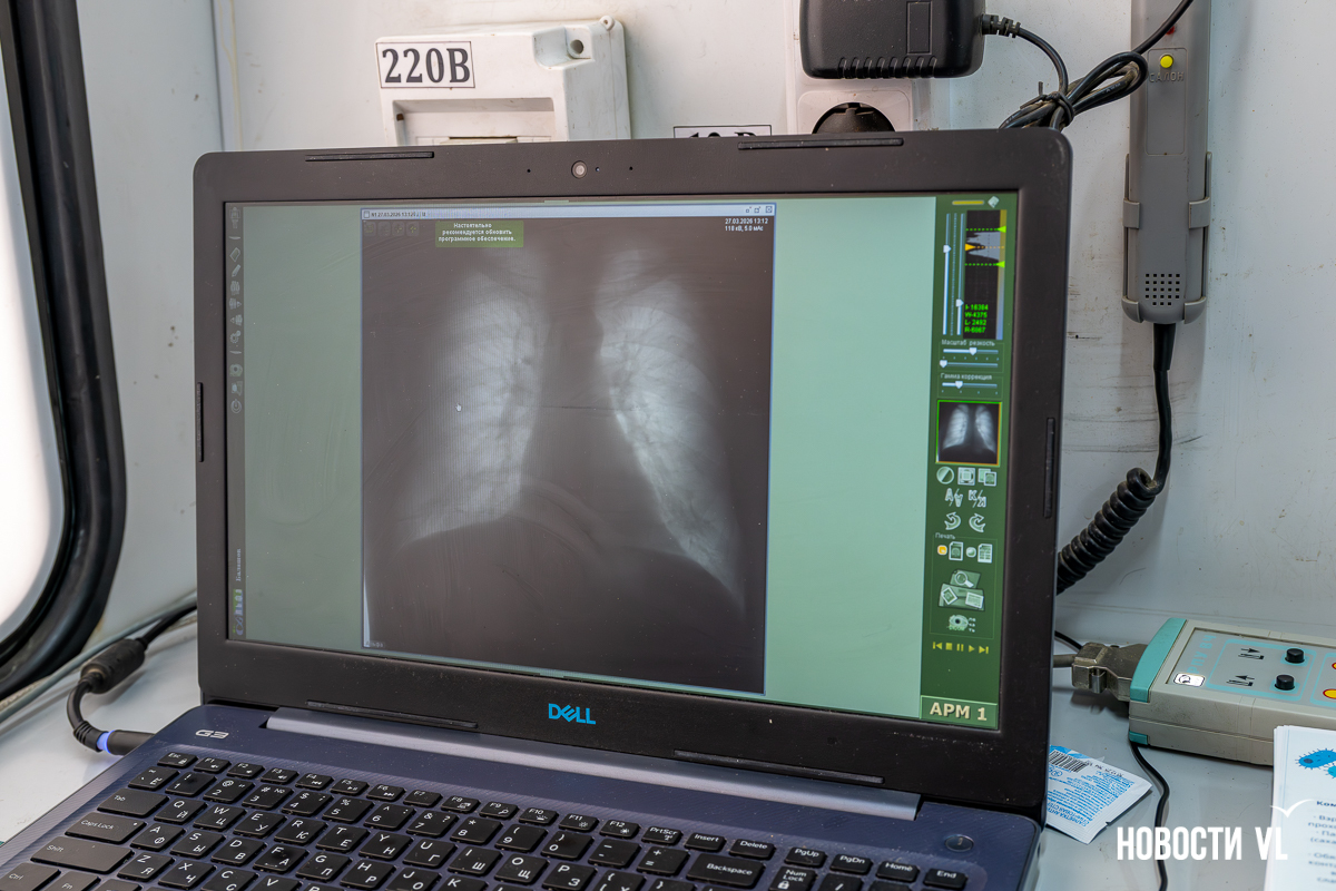 Корреспондент и фотограф Новостей VL.ru тоже прошли обследование. В автобусе тепло, как летом. Нужно снять верх, зайти в флюорограф (такой же как в больнице), положить подбородок на подставку и прижаться грудью к экрану. Не дышим секунду, выходим. Рентгенолаборант показывает снимки: «У вас всё чисто», но официально результаты оформят не раньше вторника.